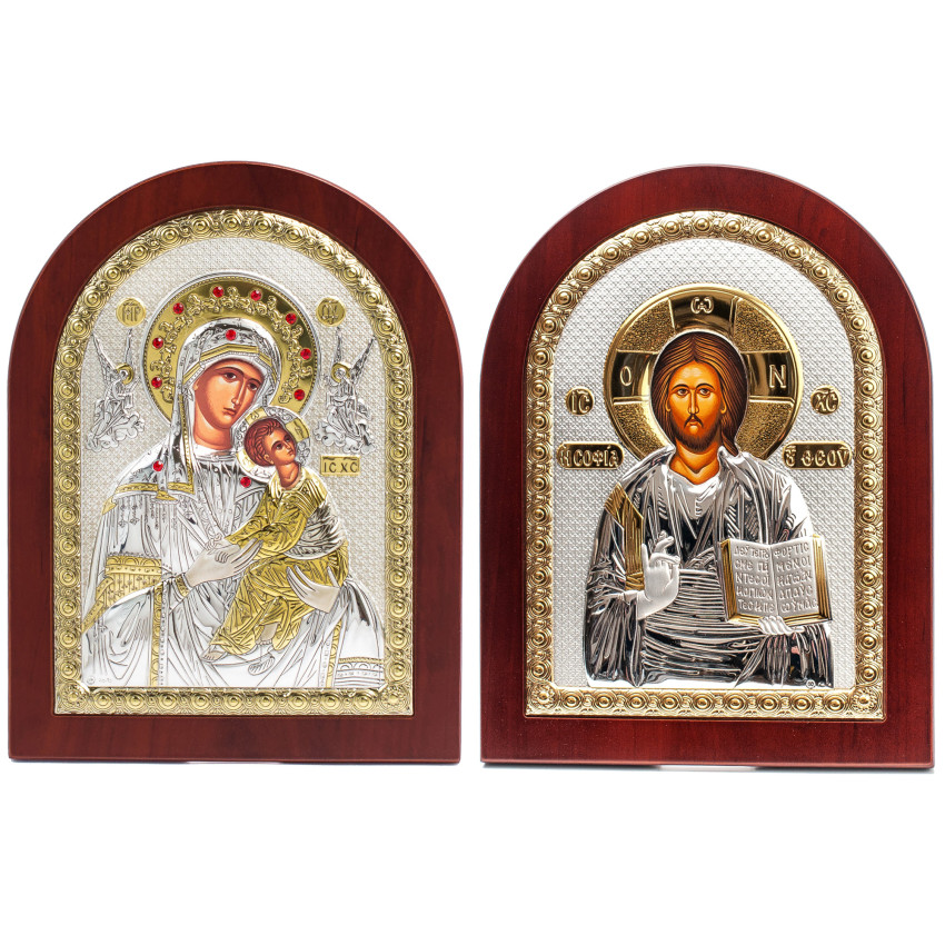 Вінчальна Пара Срібних Ікон Ісус Христос і Вифлеємська Богородиця 12х15,2см аркової форми на дереві без рамки