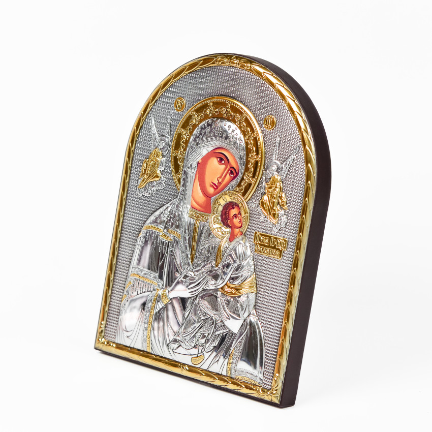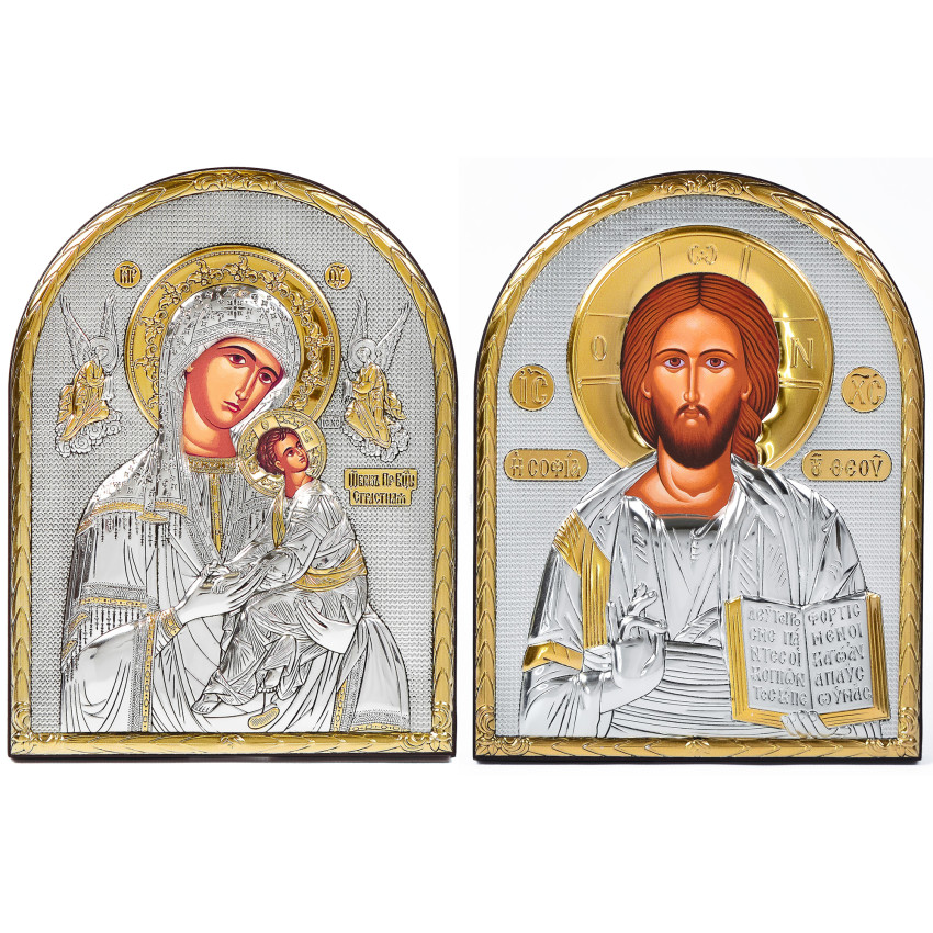 Вінчальна Пара Срібних Ікон Ісус Христос і Богородиця Неустанної Помочі 16,3х21,3см аркової форми на дереві без рамки