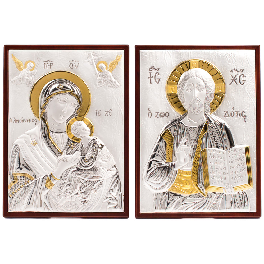 Вінчальна Пара Срібних Ікон Ісус Христос і Богородиця Неустанної Помочі 16х22см повністю в срібному окладі з позолотою