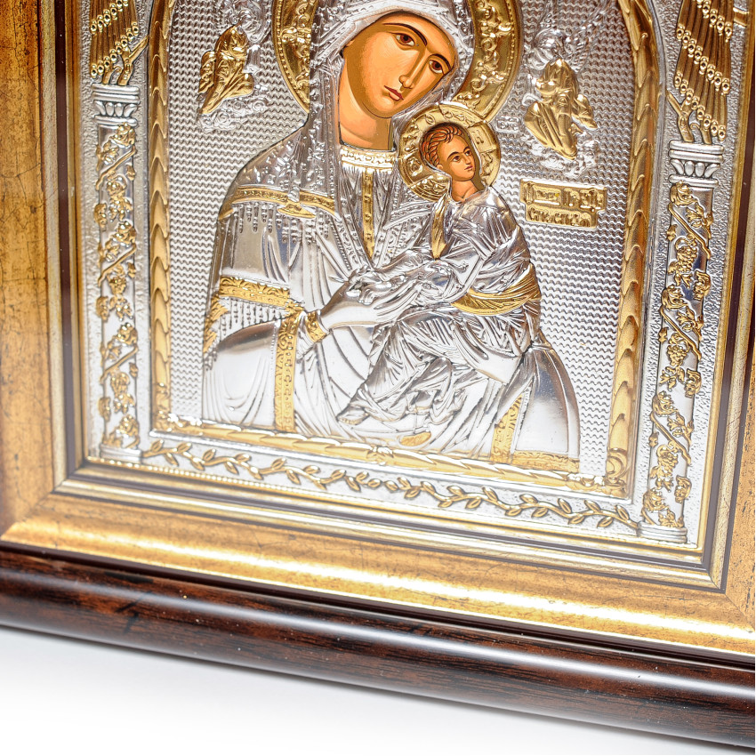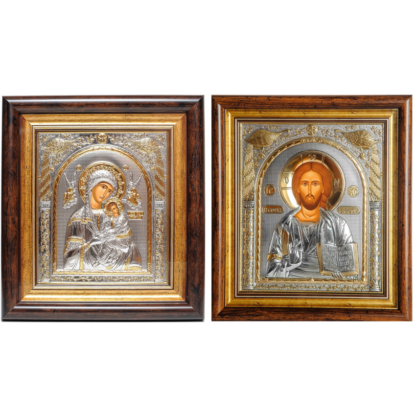 Вінчальна Пара Срібних Ікон Ісус Христос і Богородиця Неустанної Помочі 30,5х28,5см в кіоті під склом