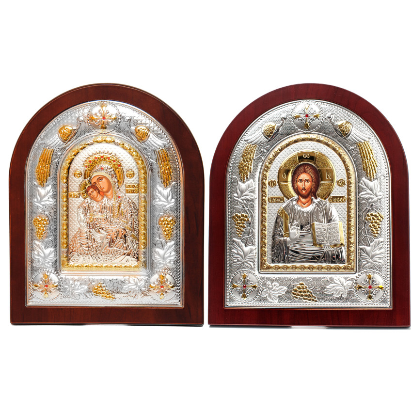 Вінчальна Пара Срібних Ікон Ісус Христос і Вишгородська Богородиця 10,7х12,8см аркової форми на дереві з рамкою