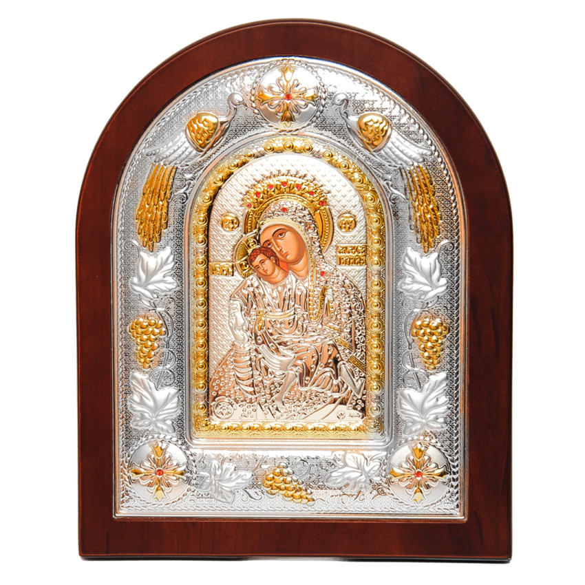 Оклад образу виготовлений із листа Miro-Silvero (італійського виробництва); нижня основа матеріалу - алюмінієвий віддзеркалюваний метал ALADO який зверху ламінований сріблом 999 проби тонким шаром. Срібло покрите захисним оксидним лаком, який зберігає матеріал від потемніння та зовнішніх подразників. Окремі частини ікони прикрашені сусальним золотом. Всі елементи сюжету ікони до найменших деталей та узорів чітко вирізьблені на окладі, які разом створюють гармонійну прекрасну картину.Поверх срібла Ікона прикрашена різнобарвною ювелірною емаллю, що придає образу більш живого та яскравого виглядуЗакріплений оклад в дерев'яній основі (кіоті) аркової форми, яка виготовлена із МДФ покритого шпоном дерева. Ззаду ікони є відкидна ніжна та отвір для кріплення на стіні.Колір дерева: коричневий (горіхова текстура).Лик ікони прописаний на полотні натуральними фарбами "Темпера" за допомогою метода шовкографії.Образ упакований в оригінальну картонну коробочку від виробника з логотипом компанії, яка має чудовий подарунковий вигляд.Ззаду на іконі є закріплений Сертифікат якості, який засвідчує оригінальність виробу.Виробник: Prince Silver Греція. ..