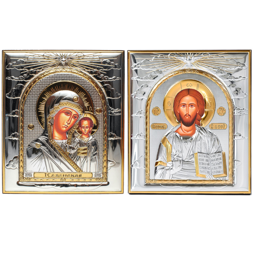 Вінчальна Пара Срібних Ікон Ісус Христос і Казанська Божа Матір 11,3х13см в рамці зі Святим Духом