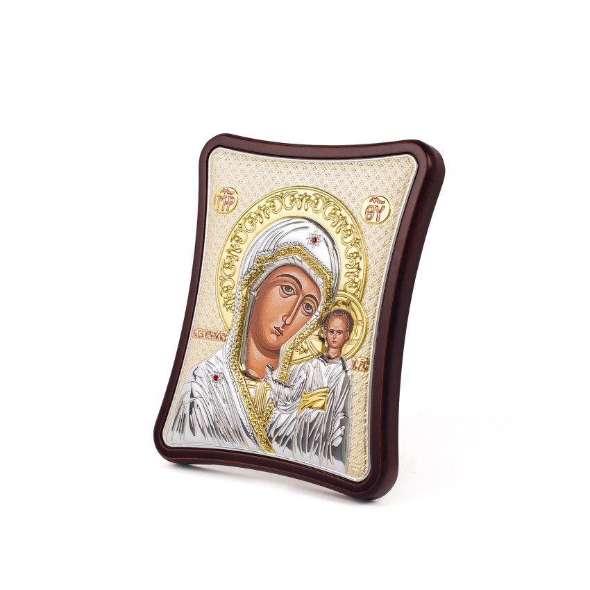 Матеріал срібного окладу зроблений із спеціального комбінованого листа металу який зверху ламінований шаром срібла 999 проби, також для захисту на поверхню наноситься родієве покриття яке захищає срібло від потемніння тя "старіння"