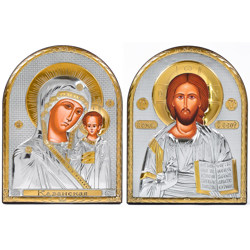 Вінчальна Пара Срібних Ікон Ісус Христос і Казанська Божа Матір 16,3х21,3см аркової форми на дереві без рамки