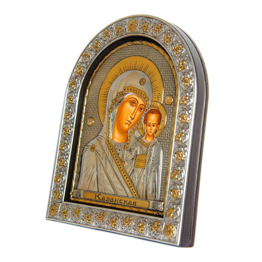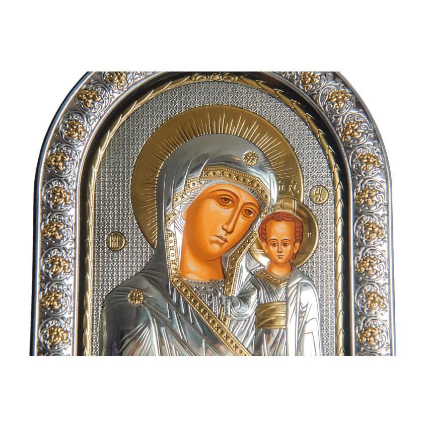 Образ має класичну аркову форму з обрамленням в дерев'яній рамці. В процесі виготовлені ікони були використані найкращі ювелірні матеріали.Оклад виробу виготовлений із комбінованого листа металу – верхня частина якого це срібний лист 925°: в окремих місцях композиція вдало прикрашена сусальним золотом що придає їй більш контрастного вигляду. За допомогою сучасних методів обробки дорогоцінних металів та новаційного устаткування, виробнику вдалося досягнути найвищої якості деталізованого зображення на сріблі - всі елементи орнаменту композиції ікони чітко вирізьблені та яскраво проглядаються до найменших дрібниць. Обличчя Святих – відкрите, воно прописане методом шовкографії на лляному полотні натуральними фарбами «темпера». Зовнішній шар дорогоцінного металу ікони покритий спеціальним захисним лаком, що уберігає срібло від потемніння та старіння, захищаючи його від зовнішніх подразників таких як пил та сонячні промені – образ зберігатиме свій первозданний вигляд багато років.Закріплений оклад на дерев'яному кіоті - МДФ покритий шпоном горіха.Ікона має відкидну ніжку-підставку та отвір для зручного вертикального розміщення на стіні. Даний виріб чудо буде підійде до інтер'єру спальної кімнати, кухні, вітальні чи дитячої кімнати.Образ виготовлений в грецькому стилі іконографії з дотриманням всіх канонів давньовізантійського іконопису.Переваги: Багатошаровий срібний матеріал 925 проби;Срібло захищене оксидним шаром від потемнінь та старіння;Гармонійне поєднання срібла з золотом;Основна частина образу закрита склом;Чіткий деталізований рельєфний узор;Унікальність;Упакування:Виріб має оригінальне фірмове упакування від виробника - ікона надійно упакована в якісній картонній коробочці в формі книжечки з логотипом компанії та м'який мішечок; дане упаковування гарантує, що виріб надійде Вам цілим та неушкодженим, а також в такому вигляді образ можна представити на подарунок близькій людині.Виробник: Silver Axion; Ексклюзивна серія ікон ЕК;Країна виробник: Греція;Купуючи в інтернет-магазині Silvericons срібний образ - Ви завжди будете впевненими у придбанні автентичного, якісного та оригінального виробу! Всі грецькі ікони мають Сертифікат Якості від виробника на тильній стороні, який засвідчує, що даний образ виготовлено на фабриці Silver Axion. Сертифікат надає Вам безстрокову Гарантію на дану ікону...