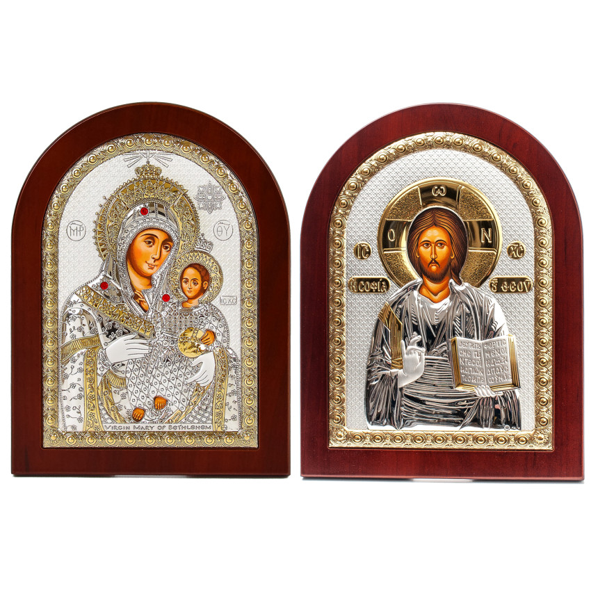 Вінчальна Пара Срібних Ікон Ісус Христос і Вифлеємська Богородиця 20х25см аркової форми на дереві з рамкою