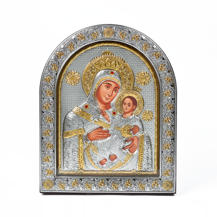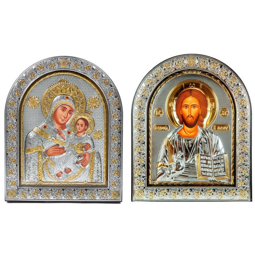 Вінчальна Пара Срібних Ікон Ісус Христос і Вифлеємська Богородиця 26х21см аркової форми під склом