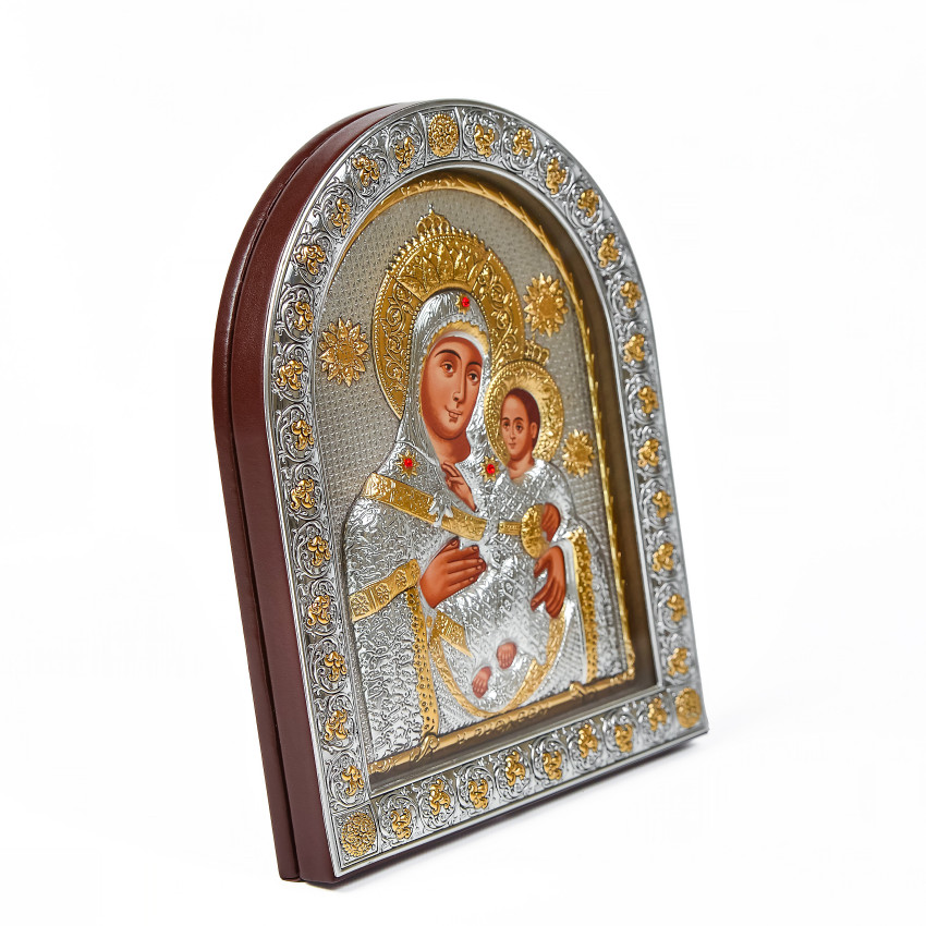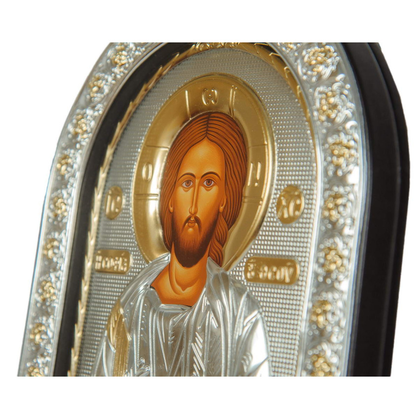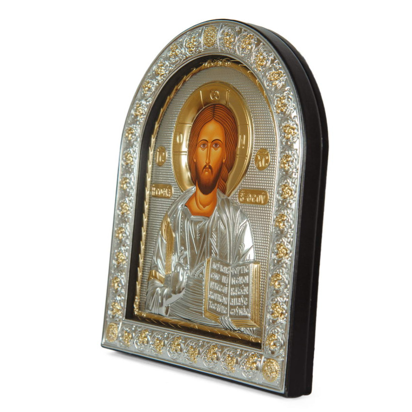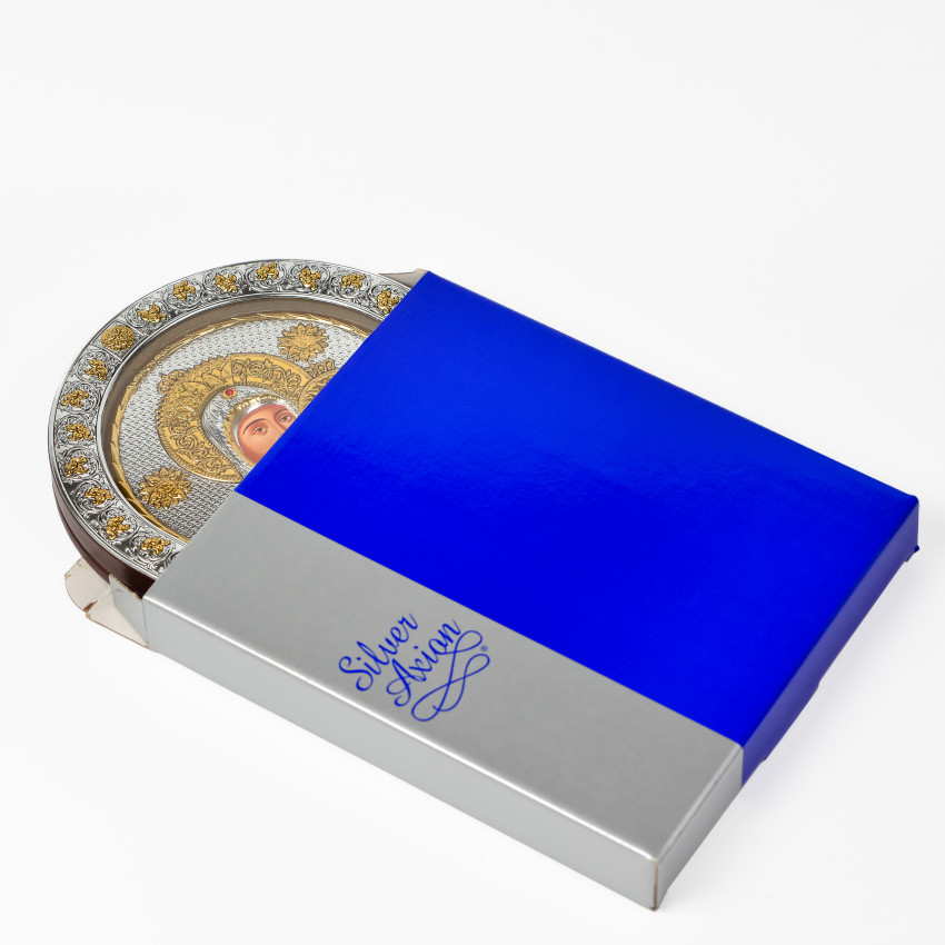 Матеріал срібного окладу зроблений із спеціального комбінованого листа металу який зверху ламінований шаром срібла 999 проби, також для захисту на поверхню наноситься родієве покриття яке захищає срібло від потемніння тя "старіння"