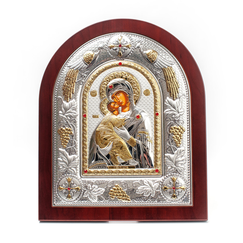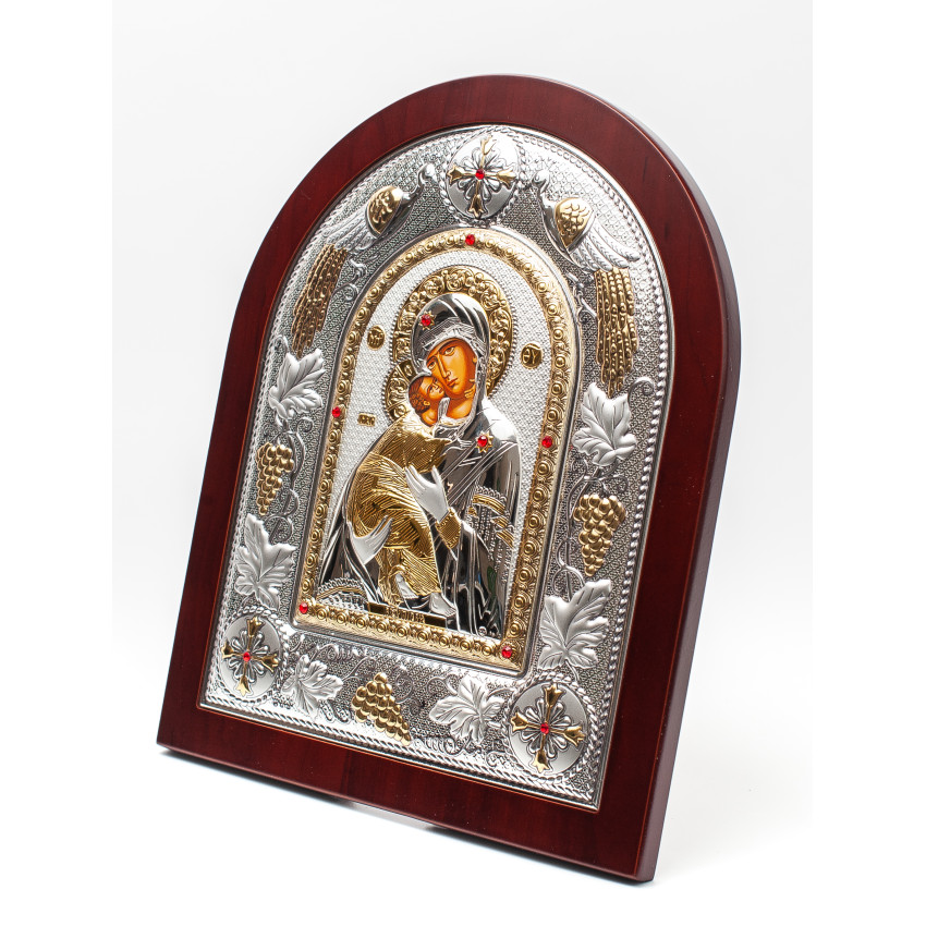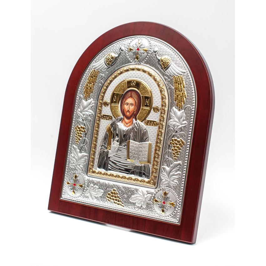 Матеріал срібного окладу зроблений із спеціального комбінованого листа металу який зверху ламінований шаром срібла 999 проби, також для захисту на поверхню наноситься родієве покриття яке захищає срібло від потемніння тя "старіння"