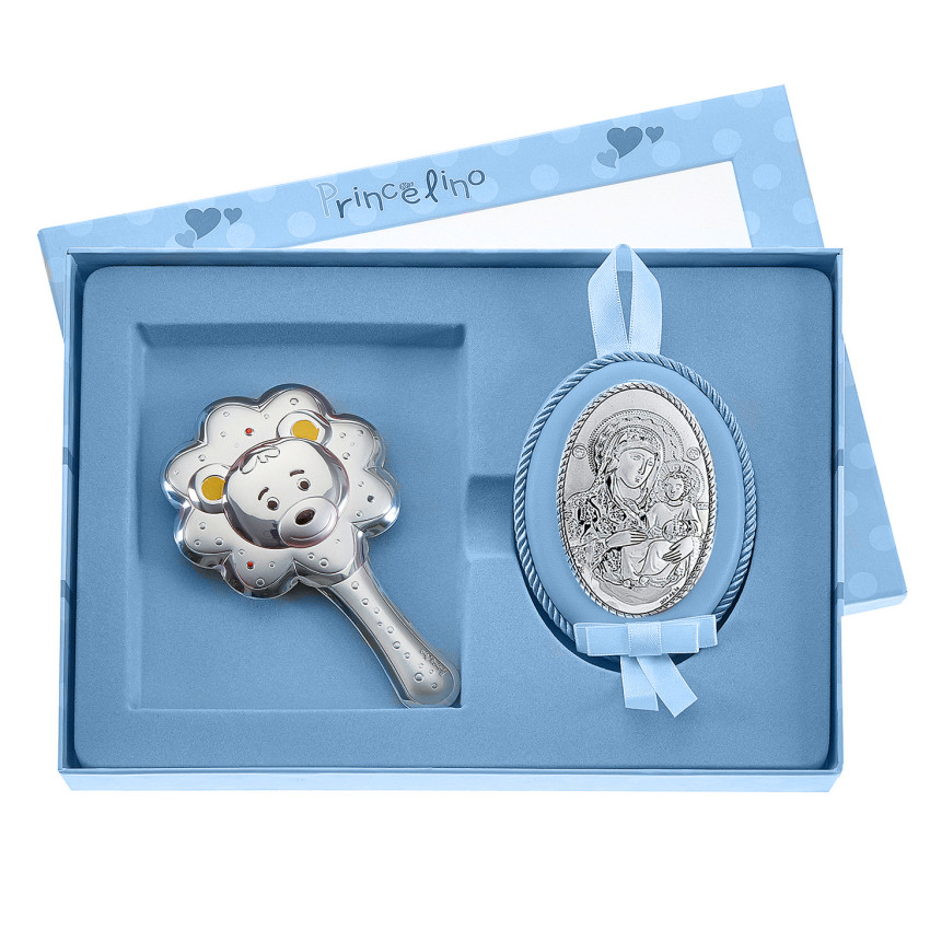 Дитячий комплект подарунків хлопчику 18х24см Срібне Брязкальце та Іконка MB/S087-1C