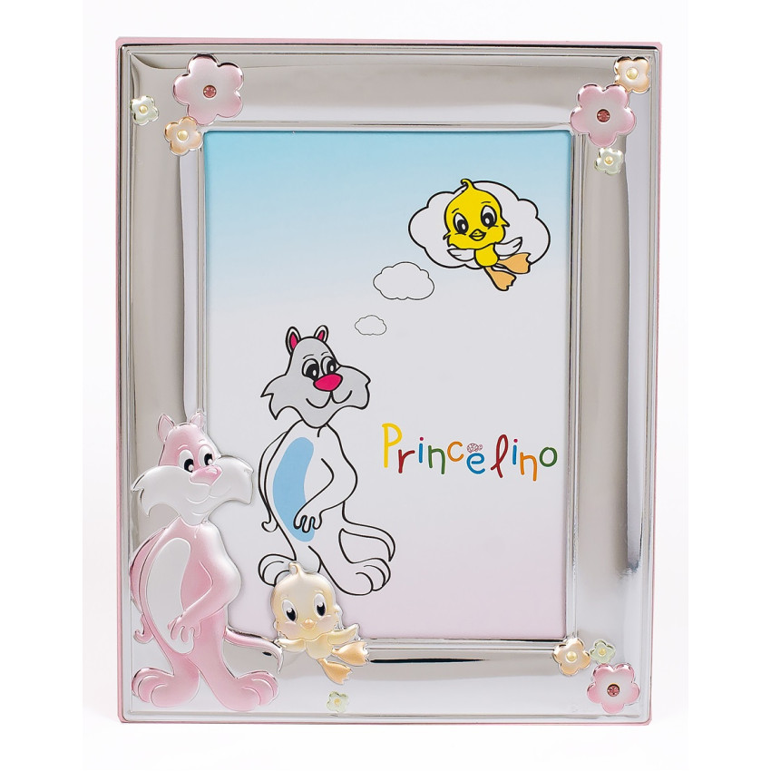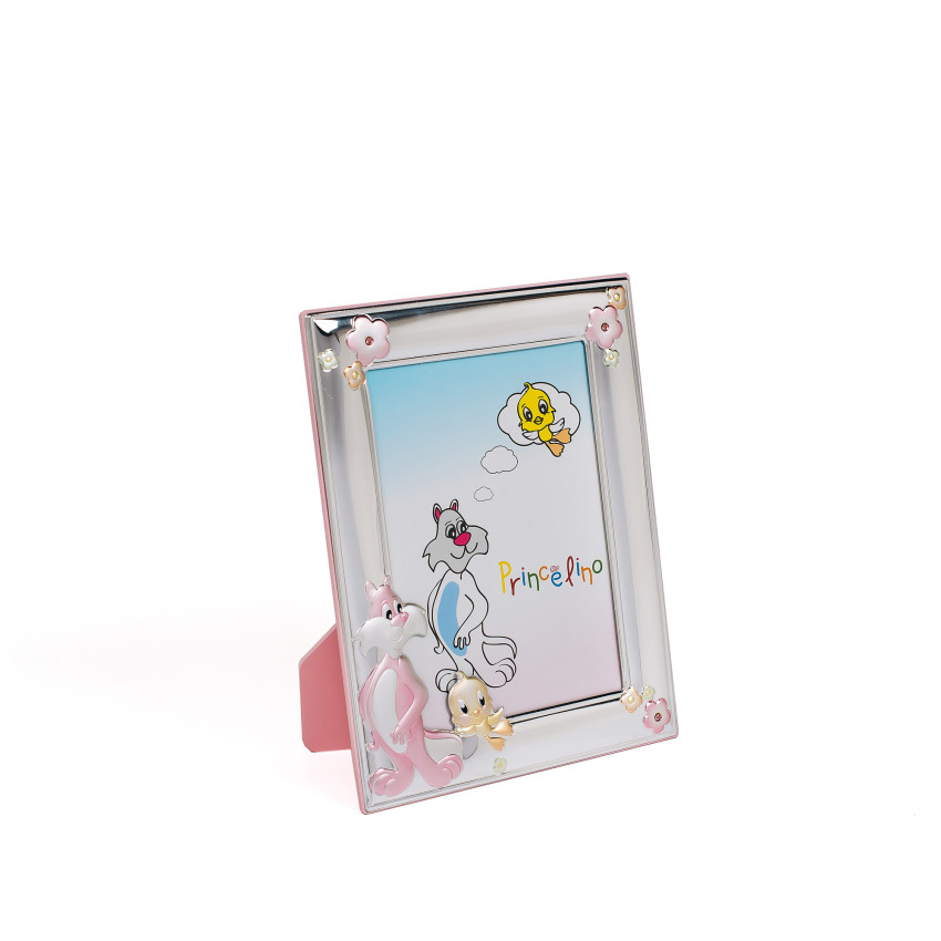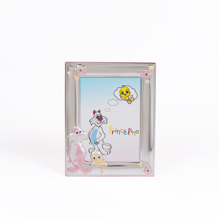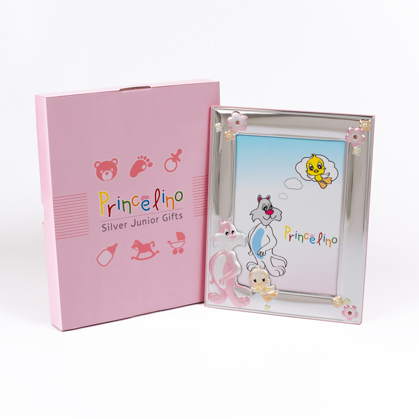 Фоторамка виготовлена за найновішою, запатентованою у всій Європі технологією MIRO-SILVER. Для основи використовувався комбінований лист, який має кілька шарів металу та срібла. Верхній шар повністю покритий сріблом 999 проби методом ламінації. Декоративні елементи виконані у вигляді фігурних картинок дитячої тематики. Всі інкрустації прикрашені кольоровою ювелірною емаллю, в кольоровій гамі переважають рожеві відтінки, що вказує на належність подарунка – для дівчаток. З часом виріб не змінює свій зовнішній вигляд і залишається таким же привабливим. Срібна основа рамки не темніє і не тьмяніє, а значить, не потребує періодичного чищення та полірування. Спеціальне покриття запобігає можливості утворення подряпин та інших дрібних механічних пошкоджень.