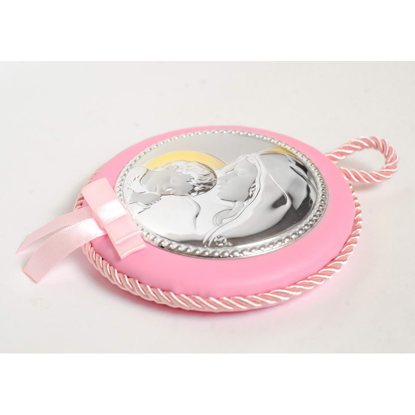Дитяча срібна іконка Марії з Дитиною d10,5см на рожевій подушечці з музикою