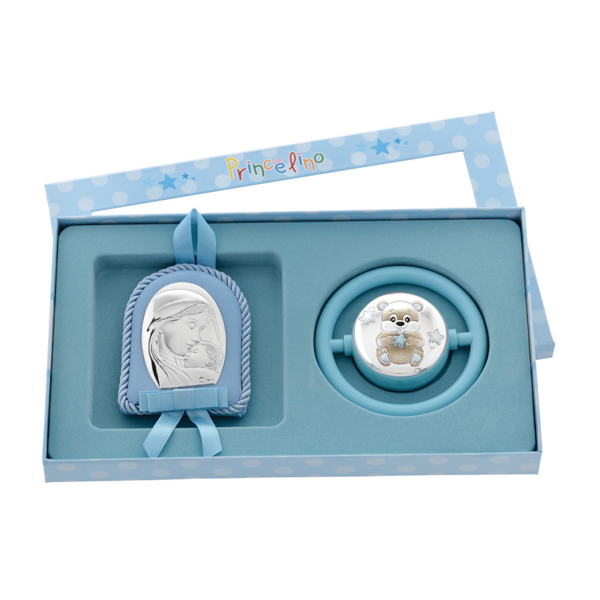 Єксклюзивний набір для хлопчика 18х24см Срібна Іконка на подушечці та Дитяче брязкальце MB/SA005-C