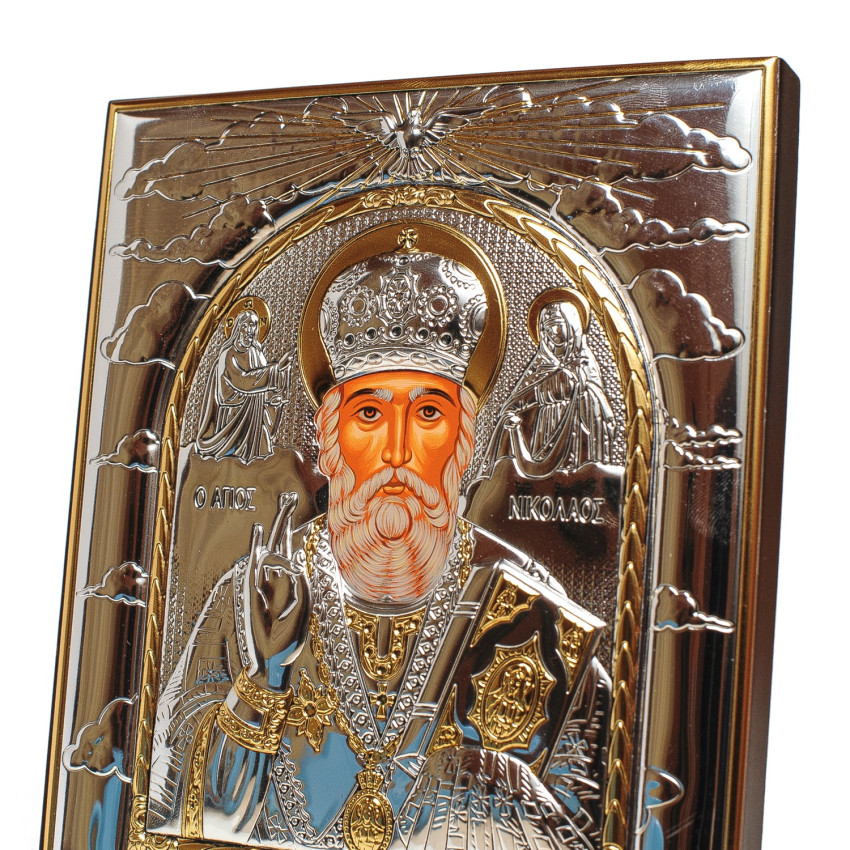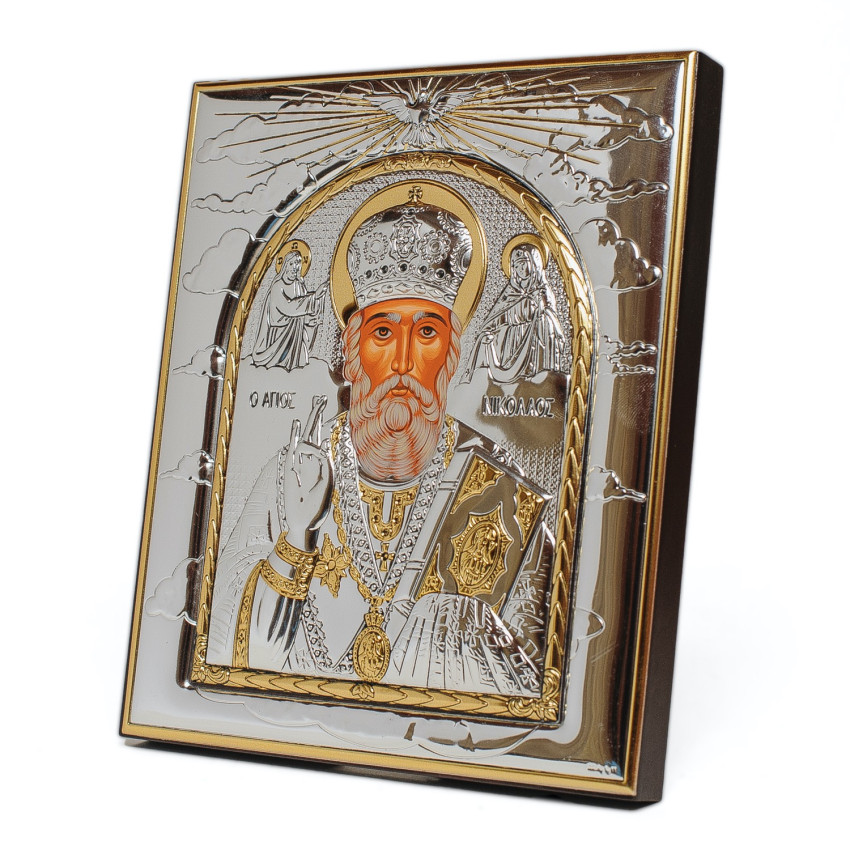 Оклад виробу виготовлений із комбінованого листа металу miro-silvero – верхня частина якого ламінована сріблом 999°: в окремих місцях композиція вдало прикрашена сусальним золотом, що придає їй більш контрастного вигляду. За допомогою сучасних методів обробки дорогоцінних металів та новаційного устаткування, виробнику вдалося досягнути найвищої якості деталізованого зображення на сріблі - всі елементи орнаменту композиції ікони чітко вирізьблені та яскраво проглядаються до найменших дрібниць. Обличчя Святих – відкрите та прописане методом шовкографії на лляному полотні натуральними фарбами «темпера». Зовнішній шар дорогоцінного металу ікони покритий спеціальним захисним лаком, що уберігає срібло від потемніння та старіння, захищаючи його від зовнішніх подразників таких як пил та сонячні промені – образ зберігатиме свій первозданний вигляд багато років.