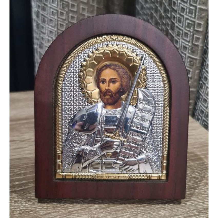 Оклад образу виготовлений із листа Miro-Silvero (італійського виробництва); нижня основа матеріалу - алюмінієвий віддзеркалюваний метал ALADO який зверху ламінований сріблом 999 проби тонким шаром. Срібло покрите захисним оксидним лаком, який зберігає матеріал від потемніння та зовнішніх подразників. Окремі частини ікони прикрашені сусальним золотом. Всі елементи сюжету ікони до найменших деталей та узорів чітко вирізьблені на окладі, які разом створюють гармонійну яскраву картину.Закріплений оклад в дерев'яній основі (кіоті) аркової форми, яка виготовлена із МДФ покритого шпоном дерева. Ззаду ікони є відкидна ніжна та отвір для кріплення на стіні.Колір дерева: коричневий (горіхова текстура).Лик ікони прописаний на полотні натуральними фарбами "Темпера" за допомогою метода шовкографії.Образ упакований в оригінальну картонну коробочку від виробника з логотипом компанії, яка має чудовий подарунковий вигляд.Ззаду на іконі є закріплений Сертифікат якості, який засвідчує оригінальність виробу.Виробник: Prince Silver Греція. ..