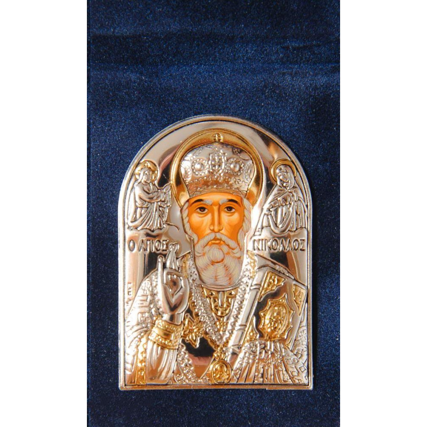 Ікона виготовлена в Греції на іконописній фабриці Prince SilveroМатеріал окладу образу зроблений із посрібленого листа Miro-Silvero, ламіновано тонким шаром срібла і зверху покрито захисним оксидним шаром, який захищає ікону від потемніння та зовнішніх подразників таких як сонячне проміння та пилюки. Образ зберігає свій первозданний вигляд багато років. В окремих місцях оклад прикрашений сусальним золотом.Основна частина образу закріплена на пластикову основу (кіот) аркової форми, який має ззаду ніжку-підставку.Образ упакований в оригінальну картонну коробочку, в якій зручно дарувати ікону на подарунок...