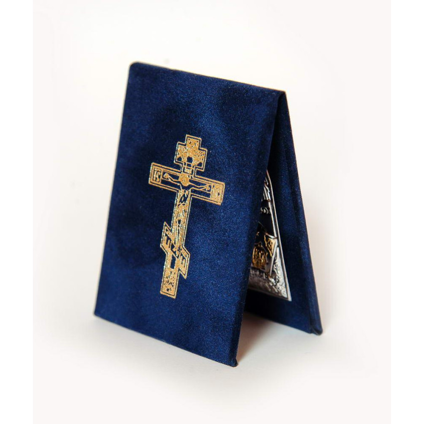 Красивая икона в форме книжечки на бархатной основе, которую удобно брать с собой в дорогу, легко помещаетесь в карман.