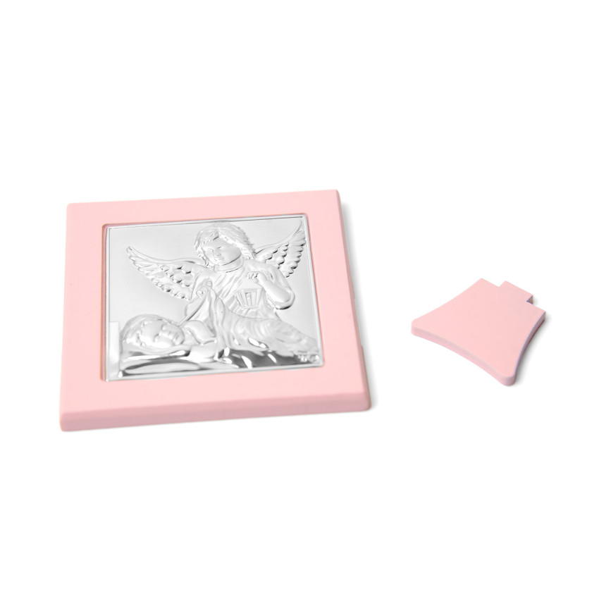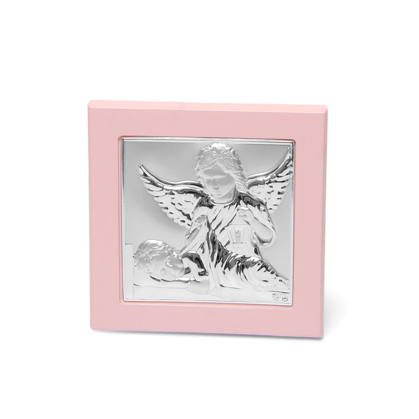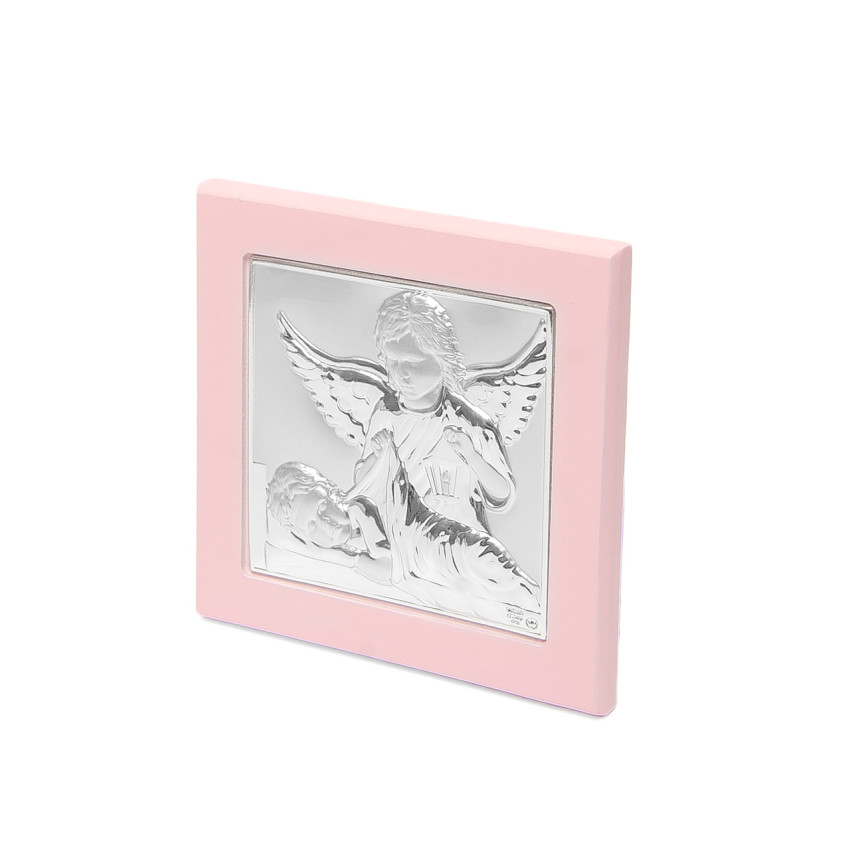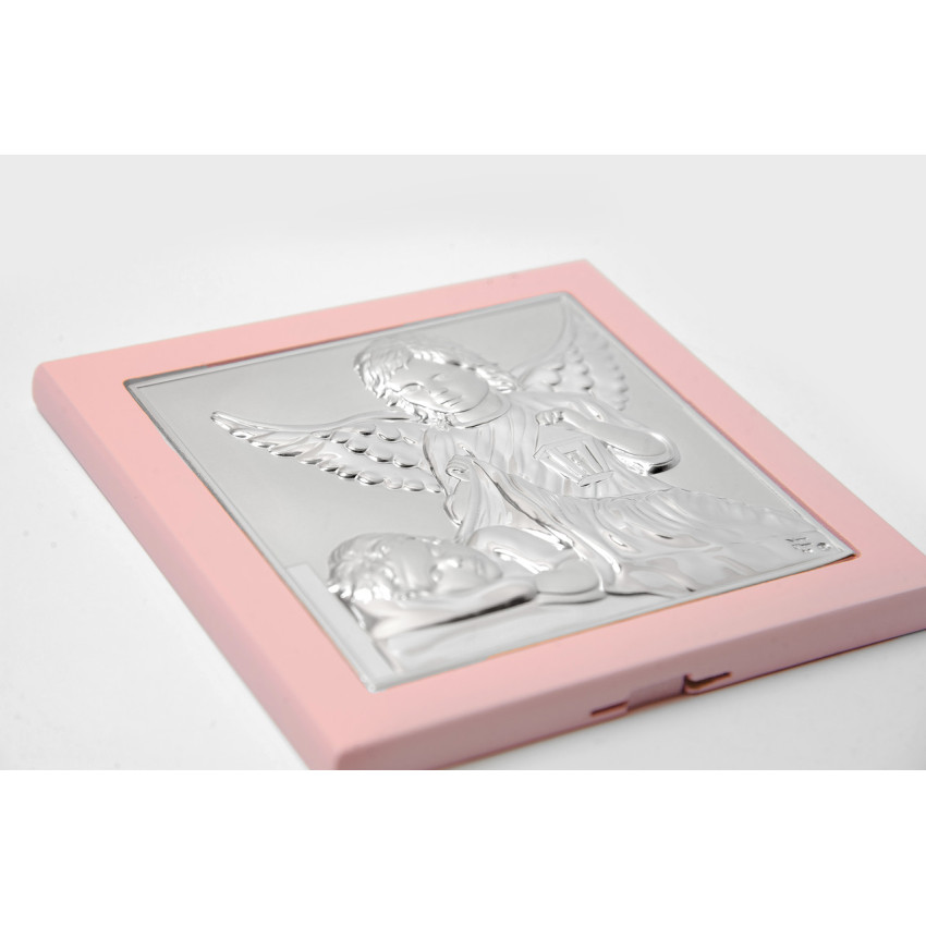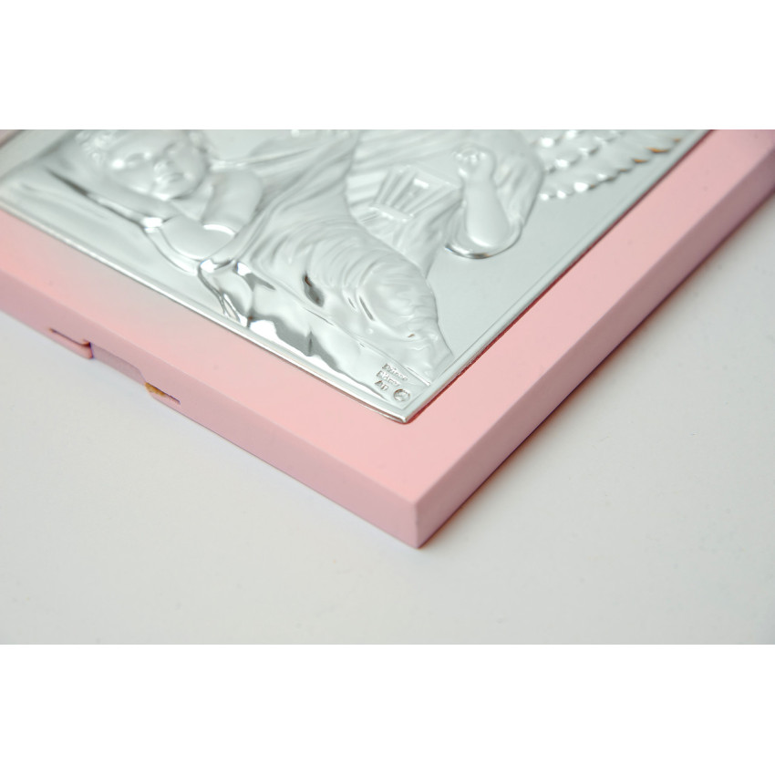 Икона полностью в серебряном окладе 925 пробы, деревянная основа в розовом цвете (для подарака ребенку девочке) икона в итальянском стиле иконографии.
