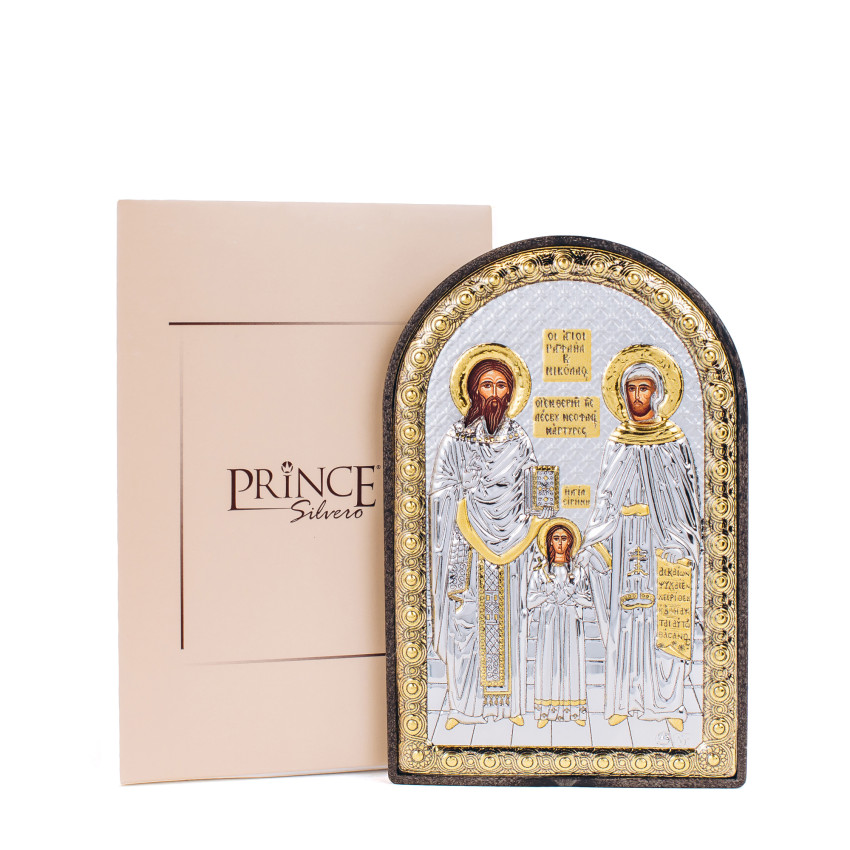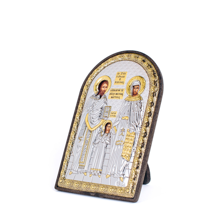 Образ має аркову форму без рамки.Оклад виробу виготовлений із комбінованого багатошарового листа металу miro-silvero – верхня частина якого ламінована сріблом 999°, та в деяких місцях прикрашена сусальним золотом. Обличчя Святих – відкрите, воно прописане методом шовкографії на лляному полотні натуральними фарбами «темпера». Зовнішній шар дорогоцінного металу ікони покритий спеціальним захисним лаком, що уберігає срібло від потемніння та старіння, захищаючи його від зовнішніх подразників таких як пил та сонячні промені – образ зберігатиме свій первозданний вигляд багато років.Основа, кіот ікони, виготовлена з тонкого пластину коричневого кольору.Ікона має відкидну ніжку-підставку для зручного вертикального розміщення. Даний виріб чудо буде підійде до інтер'єру спальної кімнати, кухні, вітальні чи дитячої кімнати.Образ виготовлений в грецькому стилі іконографії з дотриманням всіх канонів давньовізантійського іконопису.Переваги: Багатошаровий матеріал окладу miro-silvero;Захищений від потемніння срібний оклад;Гармонійне поєднання срібла з золотом;Компактна форма кіота;Чіткий рельєфний узор;Упакування:Виріб має оригінальне фірмове упакування від виробника - ікона надійно упакована в якісній картонній коробочці з логотипом компанії; дане упаковування гарантує, що виріб надійде Вам цілим та неушкодженим, а також в такому вигляді образу можна представити на подарунок близькій людині.Виробник: Silver Axion;Модельний ряд: Afon Silvero;Країна виробник: Греція;Купуючи в інтернет-магазині Silvericons срібний образ - Ви завжди будете впевненими у придбанні автентичного, якісного та оригінального виробу! На кожну придбану срібну ікону на пластиковому кіоті діє Гарантія на 3 роки!..