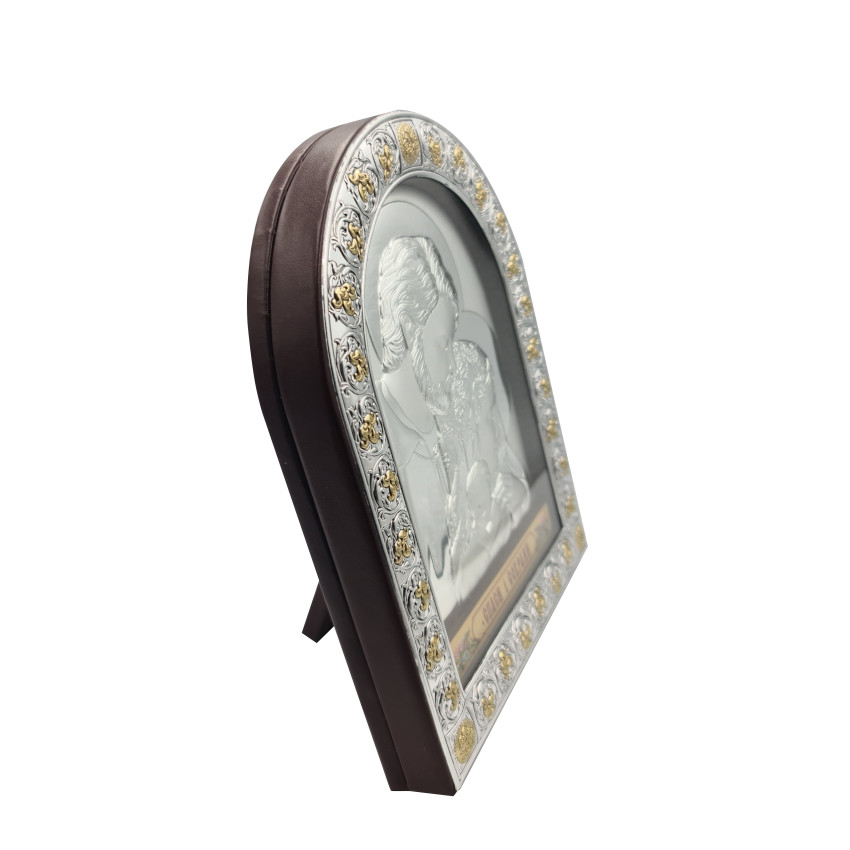Срібна Ікона Свята Сім'я 21,5х16,5см в італійському стилі іконографії арочної форми під склом в коричневій шкірі EPZ4-188BG-BR/S