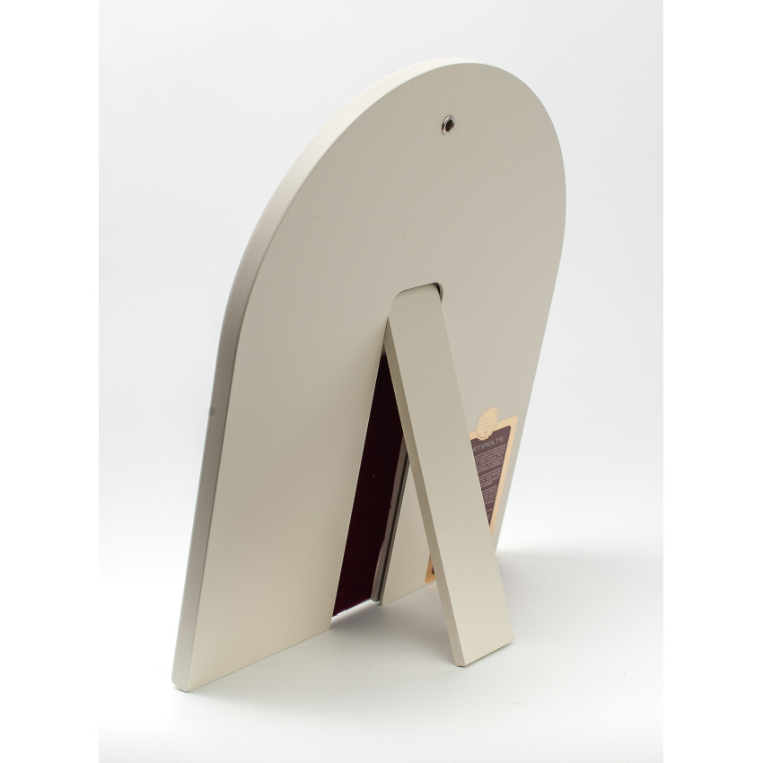 Закріплений оклад в дерев'яній основі (кіоті) аркової форми, яка виготовлена із МДФ покритого шпоном дерева. Ззаду ікони є відкидна ніжна та отвір для кріплення на стіні.