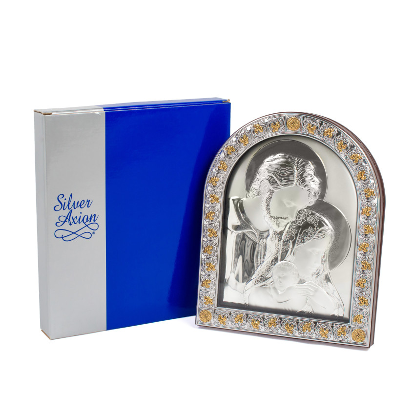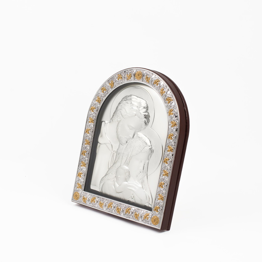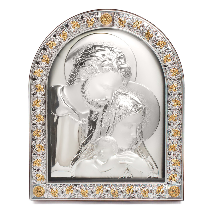 Образ Святої Сім’ї має ідеальний вигляд в першу чергу завдяки професійному виробництву компанії Silver Axion, яка займається виготовленням ікон більше 30 років. Оклад, який придає образу такий яскравий зовнішній вигляд, зроблений із інноваційного листового металу МIRO-Silvero, верхній шар має покриття чистим сріблом 999 проби окремі деталі декоровані сусальним золотом. Завдяки використанню у процесі виробництва ікони спеціальної технології з використанням атомних впроваджень в кристалічний ланцюг одного металу іншим, цей матеріал відрізняється високою стійкістю до механічних деформацій у порівнянні з традиційними технологіями сріблення. Завдяки покриттю срібла шаром захисного лаку, з часом виріб не тьмяніє, не потребує періодичної очистки, на довгі роки зберігає свій первісний вигляд.