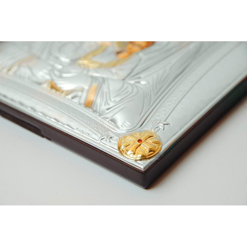 Оклад образу виготовлений із листа Miro-Silvero (італійського виробництва); нижня основа матеріалу - алюмінієвий віддзеркалюваний метал ALADO який зверху ламінований сріблом 999 проби тонким шаром. Срібло покрите захисним оксидним лаком, який зберігає матеріал від потемніння та зовнішніх подразників. Окремі частини ікони прикрашені сусальним золотом. Всі елементи сюжету ікони до найменших деталей та узорів чітко вирізьблені на окладі, які разом створюють гармонійну яскраву картину.