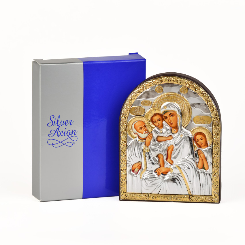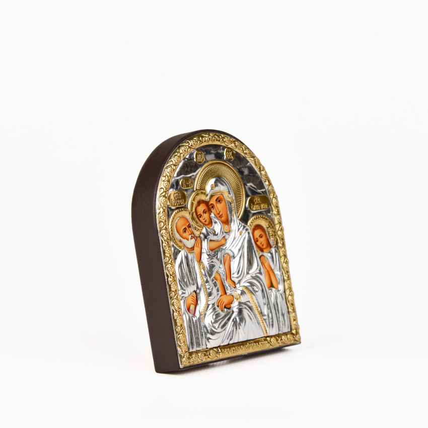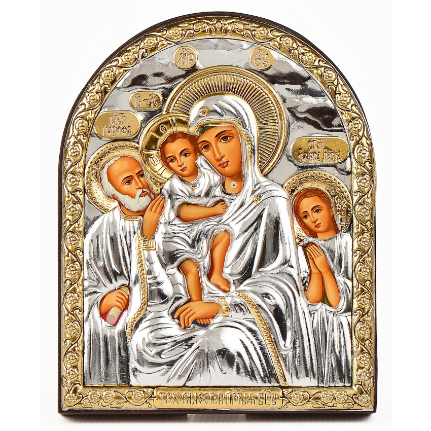 Оклад виробу виготовлений із комбінованого листа металу miro-silvero – верхня частина якого ламінована сріблом 999°: в окремих місцях композиція вдало прикрашена сусальним золотом, що придає їй більш контрастного вигляду. За допомогою сучасних методів обробки дорогоцінних металів та новаційного устаткування, виробнику вдалося досягнути найвищої якості деталізованого зображення на сріблі - всі елементи орнаменту композиції ікони чітко вирізьблені та яскраво проглядаються до найменших дрібниць. Обличчя Святих – відкрите та прописане методом шовкографії на лляному полотні натуральними фарбами «темпера». Зовнішній шар дорогоцінного металу ікони покритий спеціальним захисним лаком, що уберігає срібло від потемніння та старіння, захищаючи його від зовнішніх подразників таких як пил та сонячні промені – образ зберігатиме свій первозданний вигляд багато років.