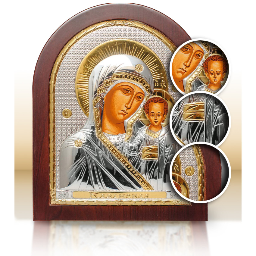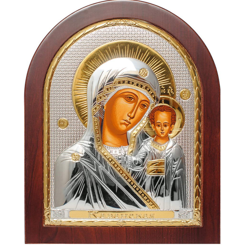 Срібна Ікона Казанської Божої Матері 20х25см арочної форми на дереві з рамкою EP5-004XAG/P