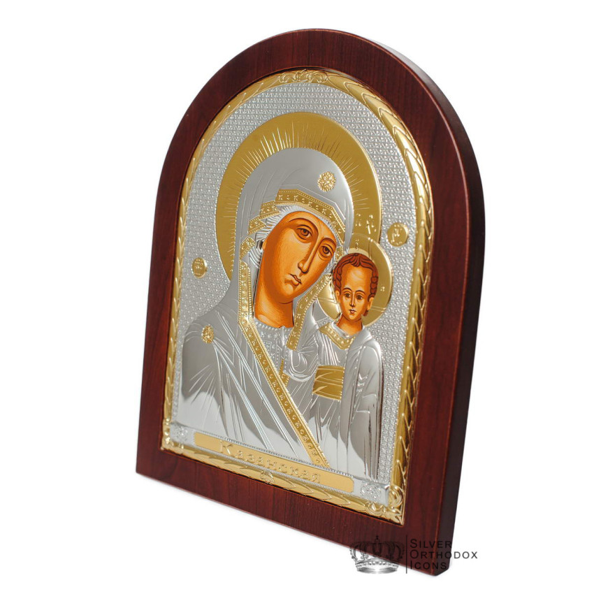 Срібна Ікона Казанська Божа Матір арочної форми на дереві