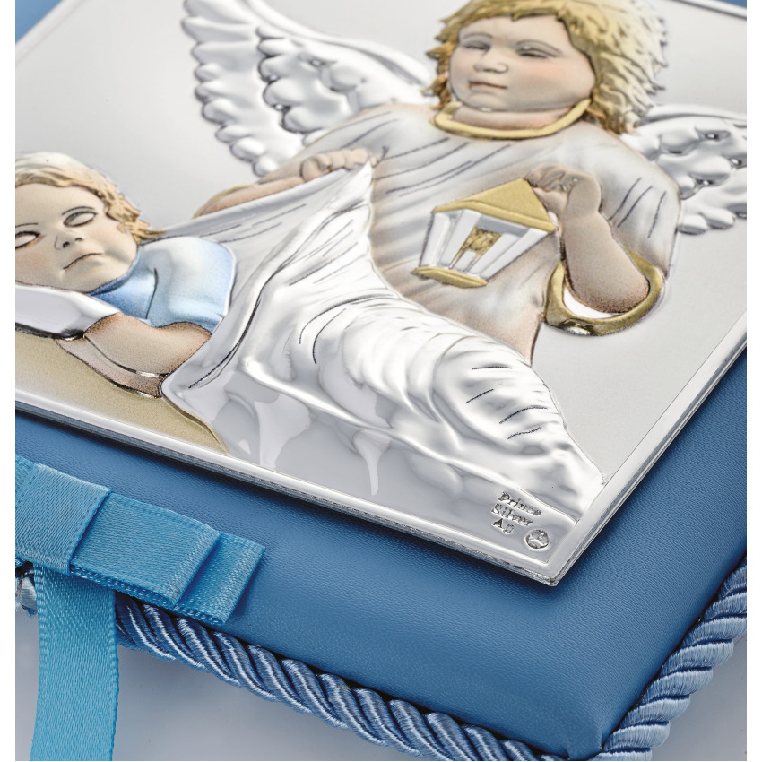 Серебряная икона "Ангел Хранитель" на мягкой синей подушечке