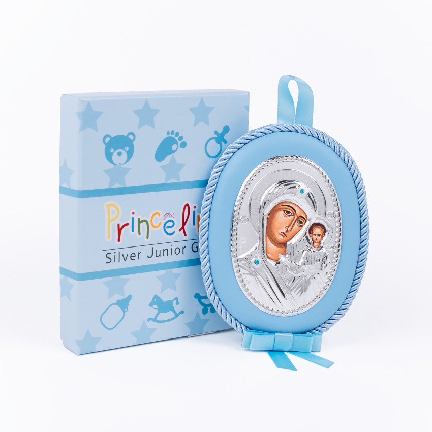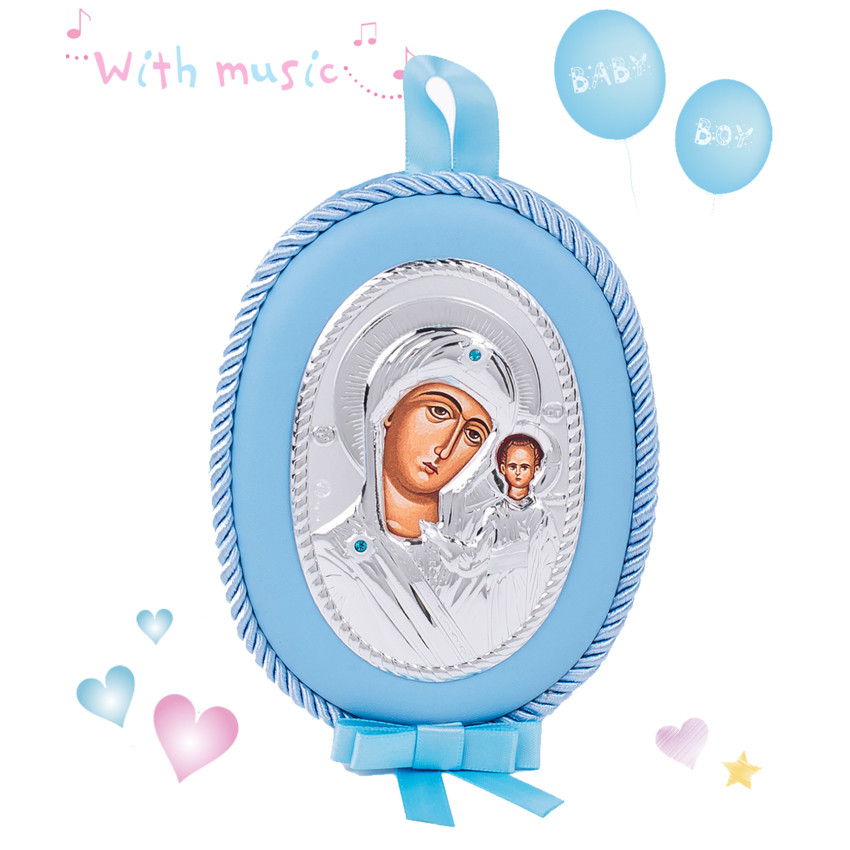 Казанська Божа Матір 10х12,5см дитяча музична іконка на синій подушечці для хлопчика MA/DM1106-LC