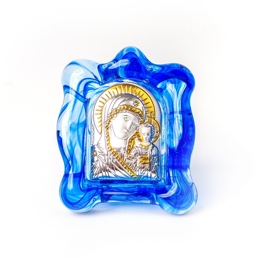 Икона Казанской Божьей Матери - сделана в серебряном окладе 925° пробы с позолотой, лик прописанный натуральными красками "темпера" методом шелкографии. Серебряный оклад закреплен в муранском стекле белого цвета.
