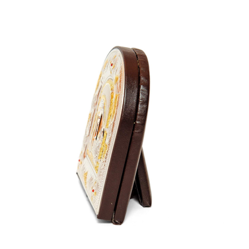 Закріплений оклад в кіоті аркової форми без рамки який ззаду обрамлений в м'яку коричневу шкіру. Ззаду ікони є відкидна ніжна підставка.