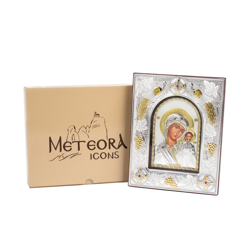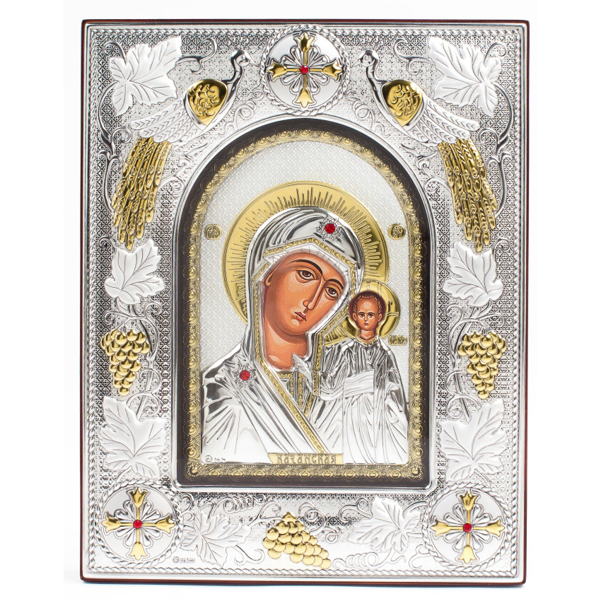 Казанська Ікона Божої Матері 14x18x3см в срібній прямокутній рамці з позолотою під склом