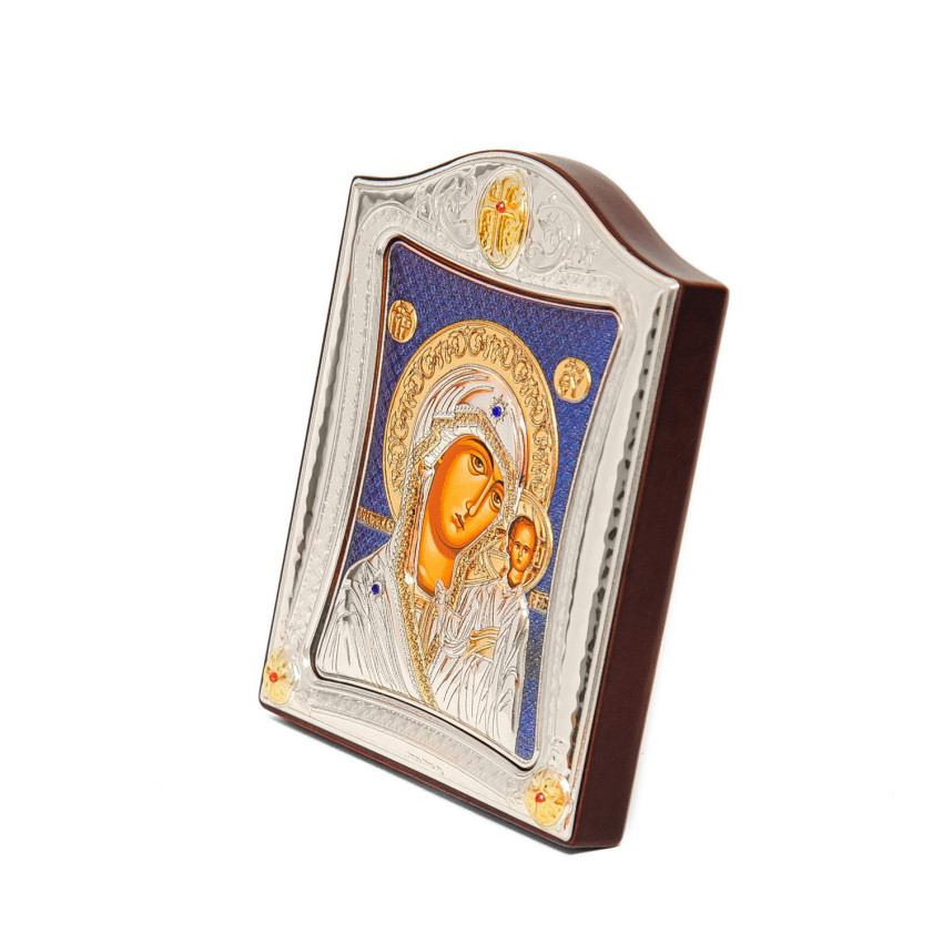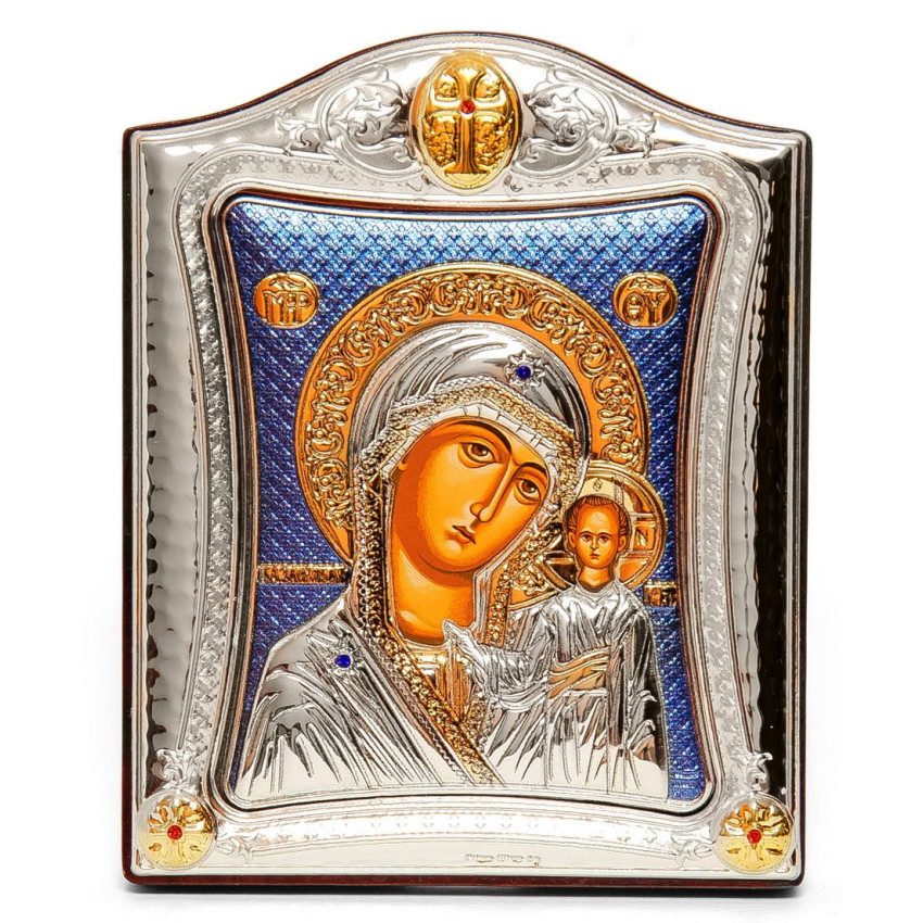 Казанська Ікона Божої Матері 20x25см на синьому фоні в срібній рамці з позолотою