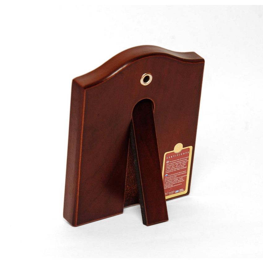 Закріплений оклад на дерев'яному кіоті (основі) прямокутної форми, яка виготовлена із МДФ покритого шпоном дерева. Ззаду ікони є відкидна ніжна та отвір для кріплення на стіні.
