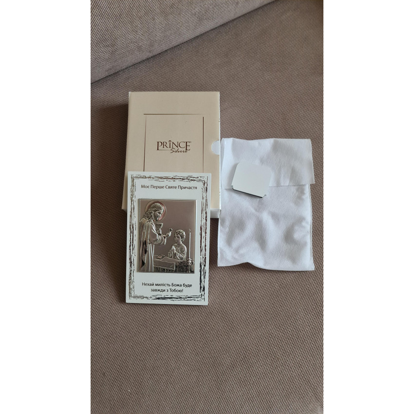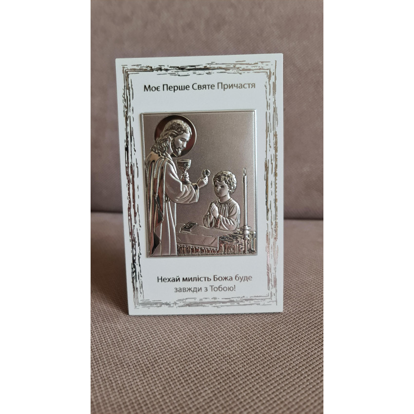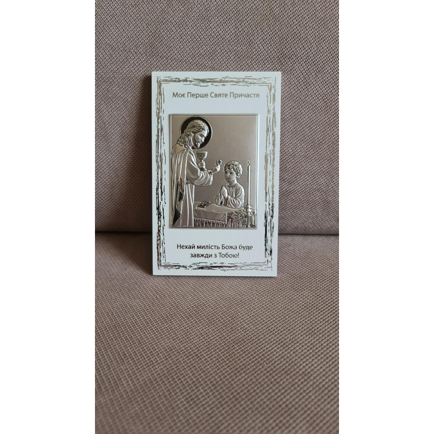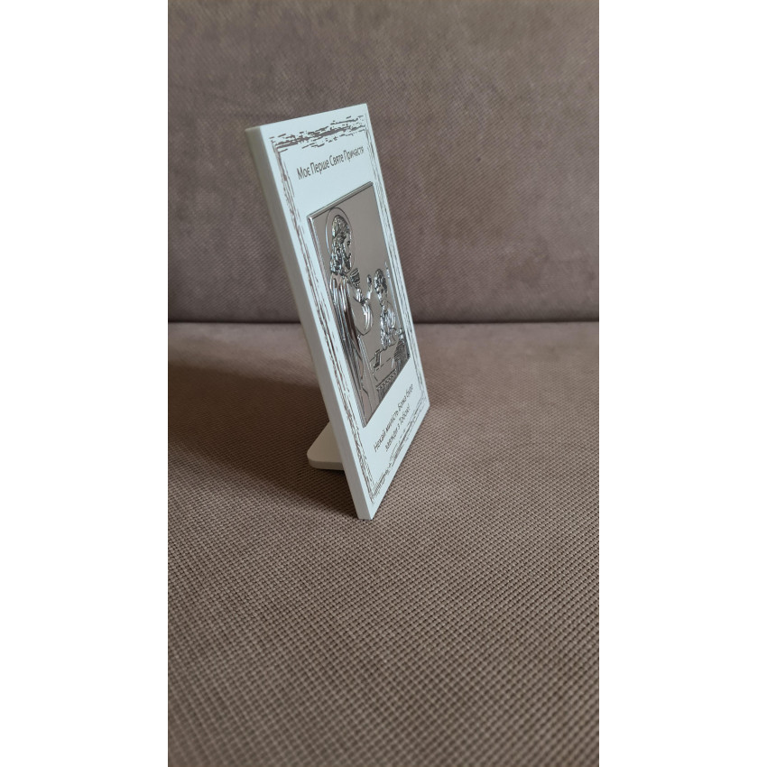 Срібна ікона для хлопчика «Моє Перше Святе Причастя» виконана у вигляді прямокутної рамки на світлій основі з металевим рельєфним медальйоном, розмір 10×16 см. Медальйон виготовлений зі срібної ламінації 999 проби і містить детально пророблену рельєфну сцену. Вигляд виробу урочистий і вишуканий.