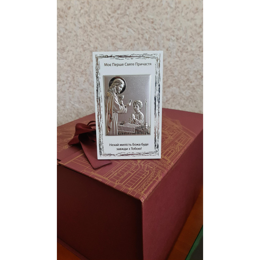 У центрі зображений Ісус Христос, який тримає чашу і подає причастя хлопчику, що молиться на колінах. Поруч — відкрита книга, хрест і запалена свічка, що символізують Слово Боже, жертву і присутність Духа Святого. Вгорі напис «Моє Перше Святе Причастя», внизу — «Нехай милість Божа буде завжди з Тобою!». Ікона на перше причастя з таким особистим зверненням до дитини особливо зворушує.