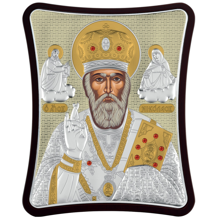 Оклад образу виготовлений із листа Miro-Silvero (італійського виробництва); нижня основа матеріалу - алюмінієвий віддзеркалюваний метал ALADO який зверху ламінований сріблом 999 проби тонким шаром. Срібло покрите захисним оксидним лаком, який зберігає матеріал від потемніння та зовнішніх подразників. Окремі частини зображеного на іконі святого, а також задній фон зображення прикрашені сусальним золотом. Всі елементи сюжету ікони до найменших деталей та узорів чітко вирізьблені на окладі, які разом створюють гармонійну яскраву картину.