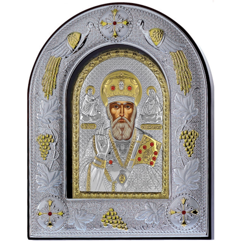 Оклад образу виготовлений із листа Miro-Silvero (італійського виробництва);  нижня основа матеріалу - алюмінієвий віддзеркалюваний метал ALADO який зверху ламінований сріблом 999 проби тонким шаром. Срібло покрите захисним оксидним лаком, який зберігає матеріал від потемніння та зовнішніх подразників. Окремі частини ікони прикрашені сусальним золотом. Всі елементи сюжету ікони до найменших деталей та узорів чітко вирізьблені на окладі, які разом створюють гармонійну яскраву картину.