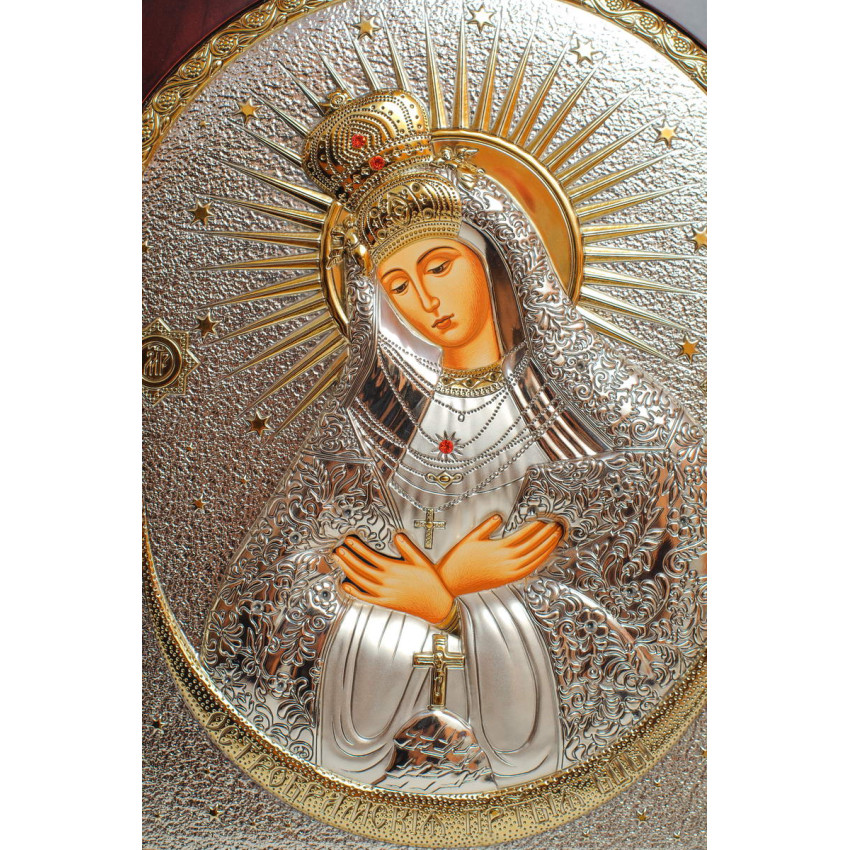 Оклад виробу виготовлений із комбінованого листа металу – верхня частина якого це срібний лист 925°: в окремих місцях композиція вдало прикрашена сусальним золотом що придає їй більш контрастного вигляду. За допомогою сучасних методів обробки дорогоцінних металів та новаційного устаткування, виробнику вдалося досягнути найвищої якості деталізованого зображення на сріблі - всі елементи орнаменту композиції ікони чітко вирізьблені та яскраво проглядаються до найменших дрібниць. Обличчя Святих – відкрите, воно прописане методом шовкографії на лляному полотні натуральними фарбами «темпера». Зовнішній шар дорогоцінного металу ікони покритий спеціальним захисним лаком, що уберігає срібло від потемніння та старіння, захищаючи його від зовнішніх подразників таких як пил та сонячні промені – образ зберігатиме свій первозданний вигляд багато років.