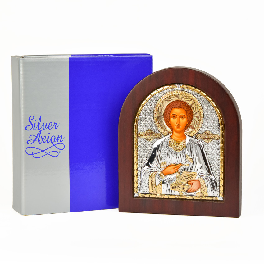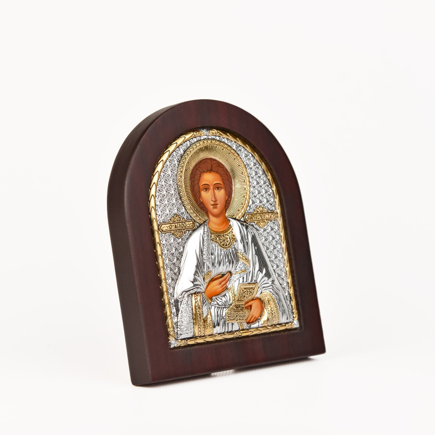 Пантелеймон Цілитель 14,7х18см срібна ікона арочної форми на дереві