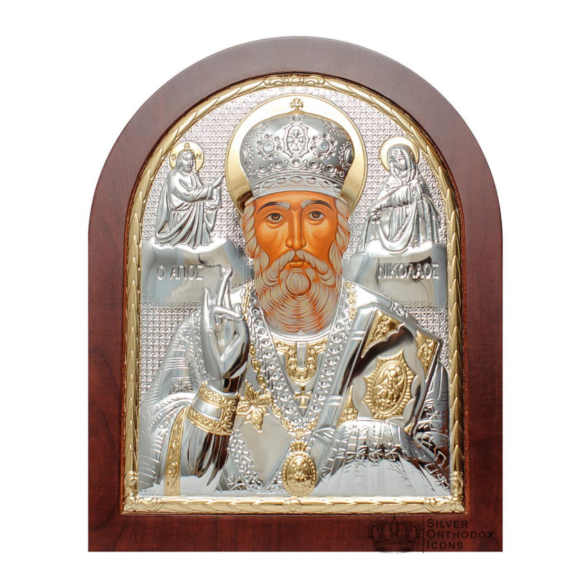 Срібна Ікона Святого Миколая Чудотворця 10,7х12,8см арочної форми на дереві з рамкою EP3-009XAG/P