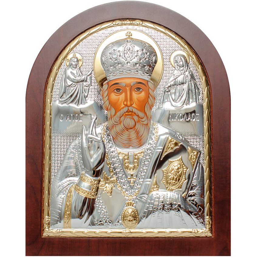 Срібна Ікона Святого Миколая Чудотворця 20х25см арочної форми на дереві з рамкою EP5-009XAG/P