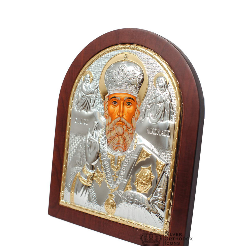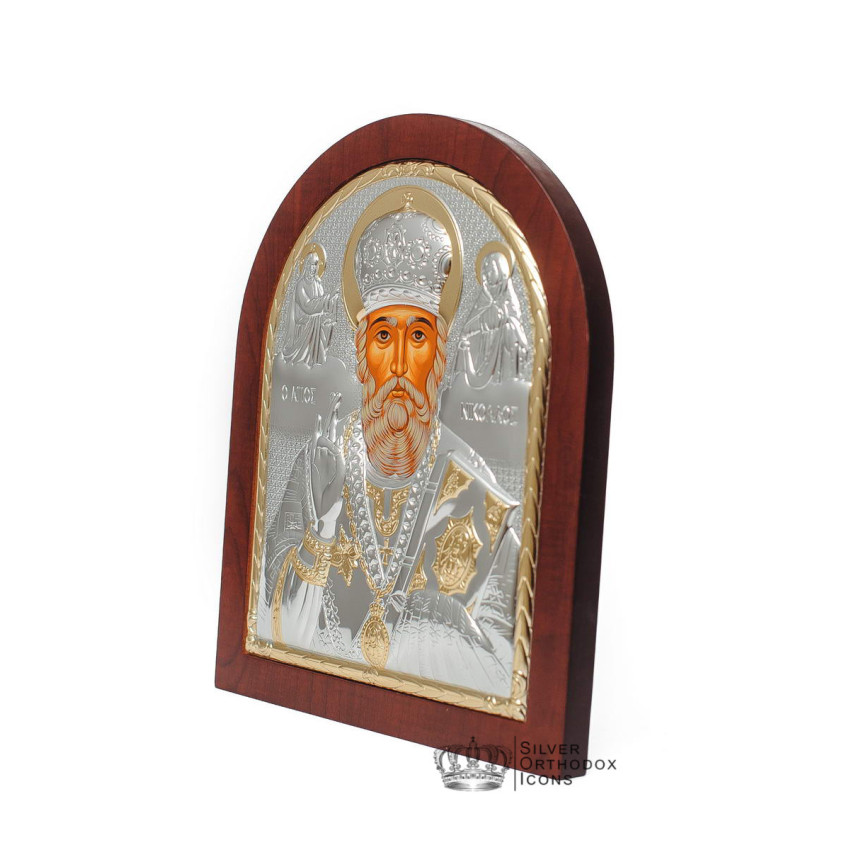 Срібна Ікона Святого Миколая Чудотворця 20х25см аркової форми на дереві