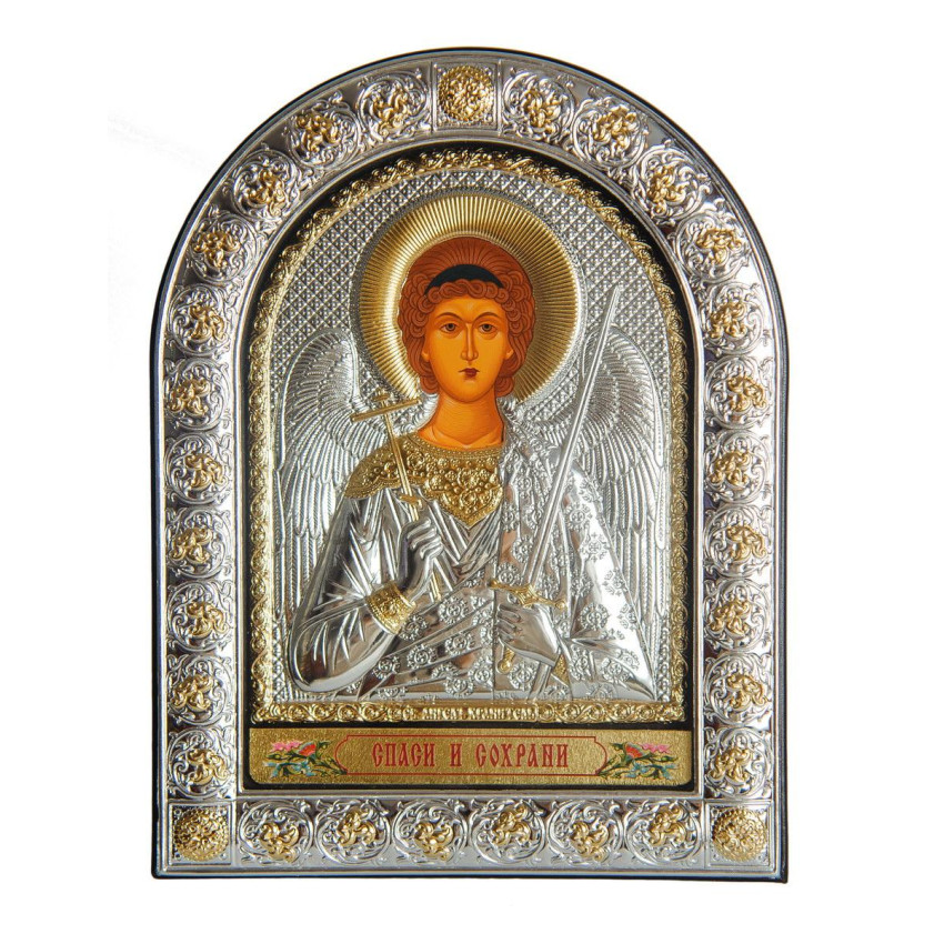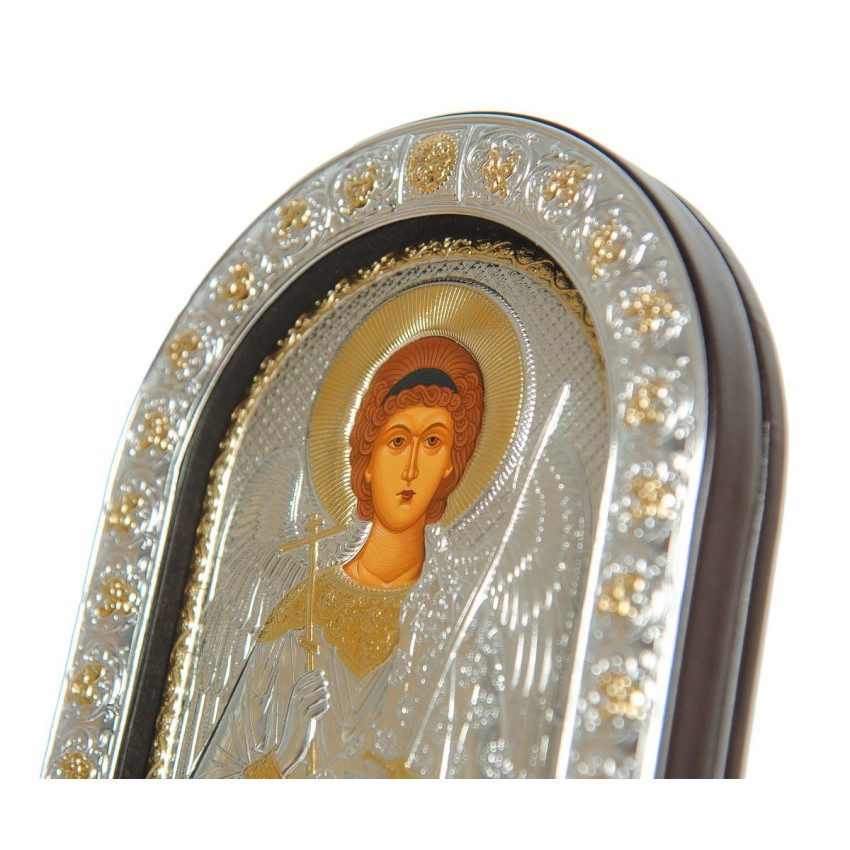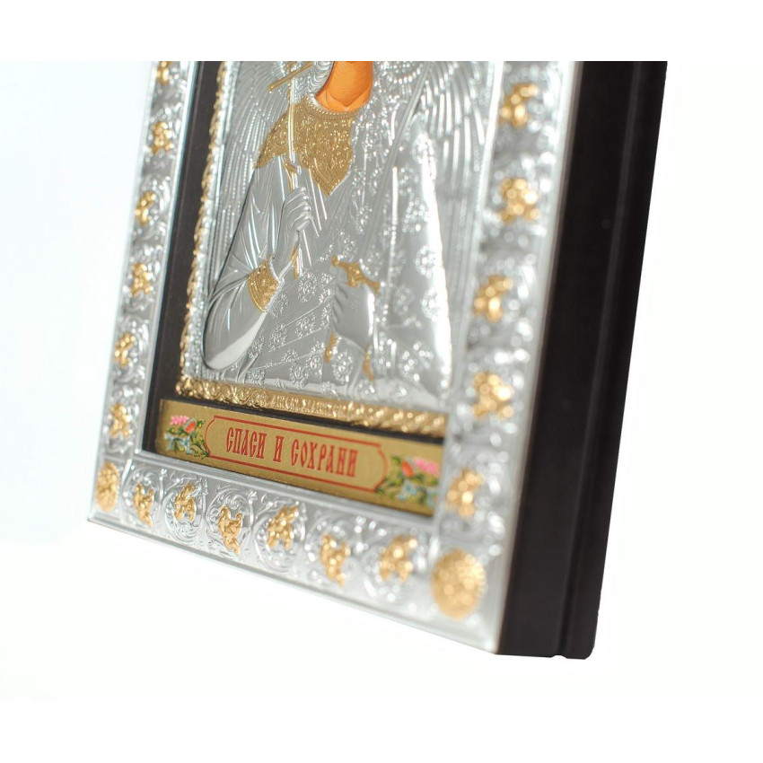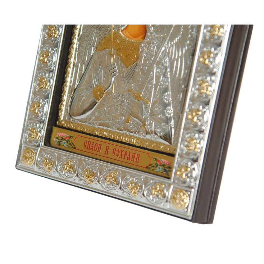 Предлагаемая Иконы "Ангел Хранитель" сделана из серебряного оклада 925 пробы и позолоты , лик прописанный натуральными красками "темпера" методом шелкографии на натуральному холсте. Икона закрыта стеклом з серебряной рамкой украшенной орнаментом в виде цветов. Ссади икона покрыта тонкой кожей , есть откидная ножка. Сделана икона по всем православным канонам в старом византийском стиле, на лучшей иконописной фабрике Silver Axion (Греция)