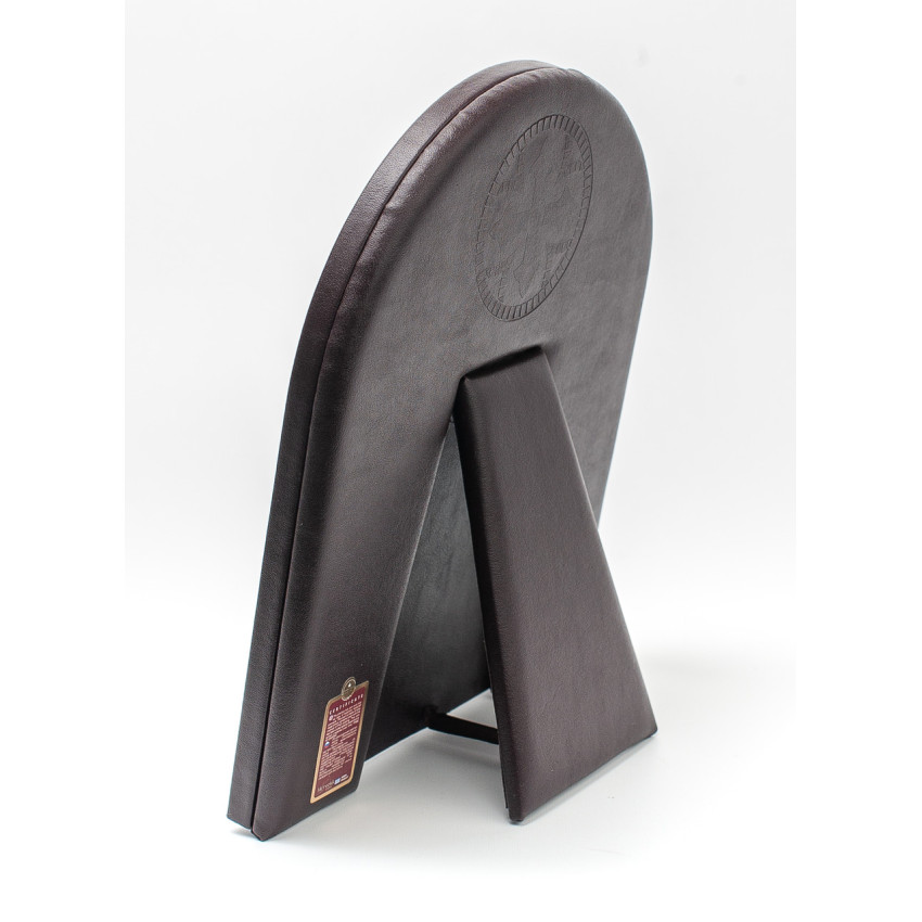 серебряный оклад арочной формы с позолотой который крепиться на основание обтянутое в коже с откидной ножкой-подставкой
