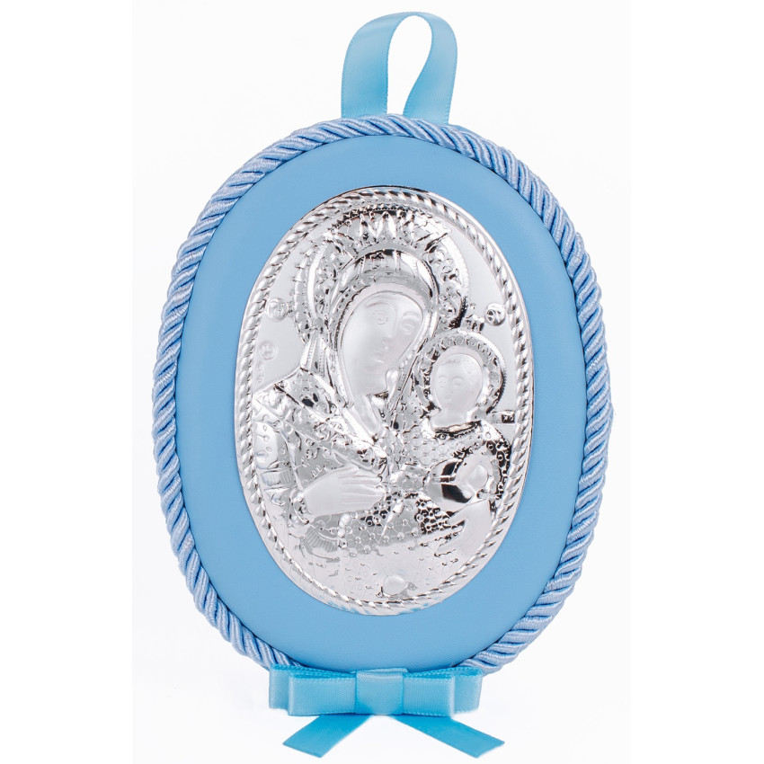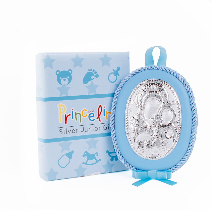 Серебряный оклад изготовлена из из алюминиевого основания покрытого на лицевой части ламинированным слоем серебра 925, закреплен на мягкой синей подушечке синего цвета, которую удобно вешать в кроватку!